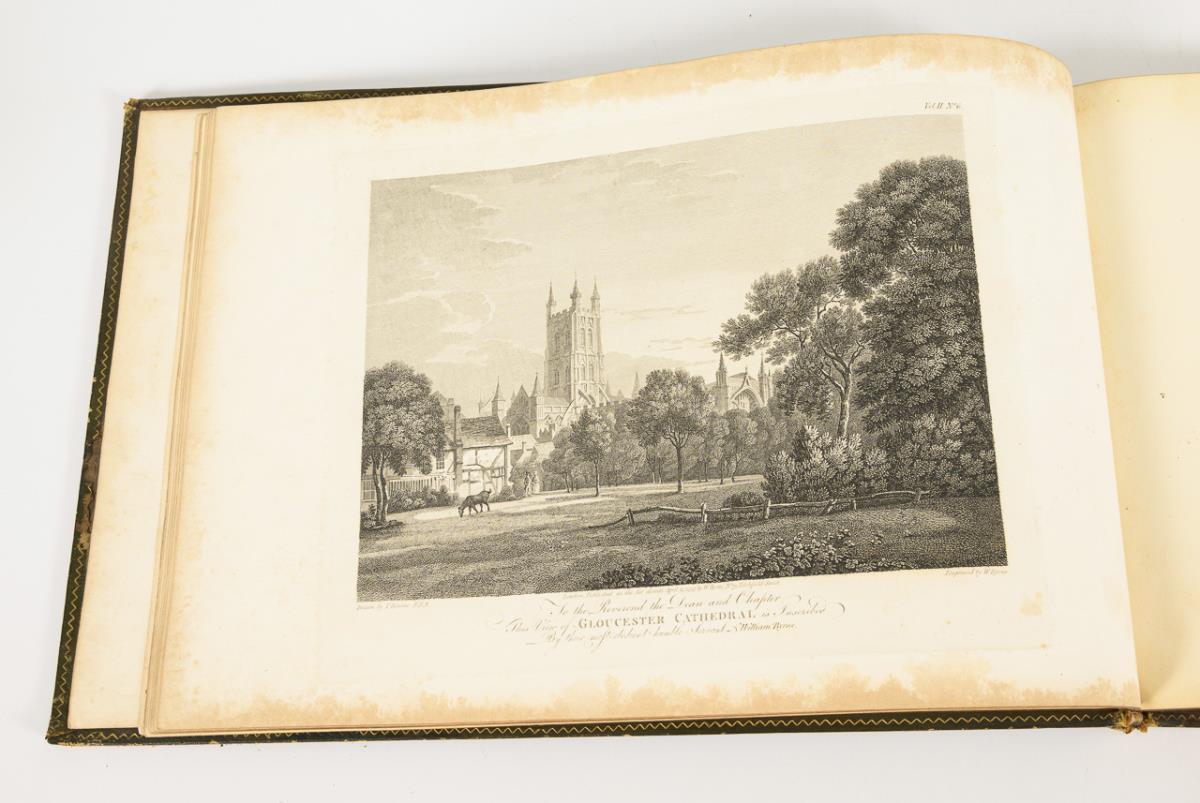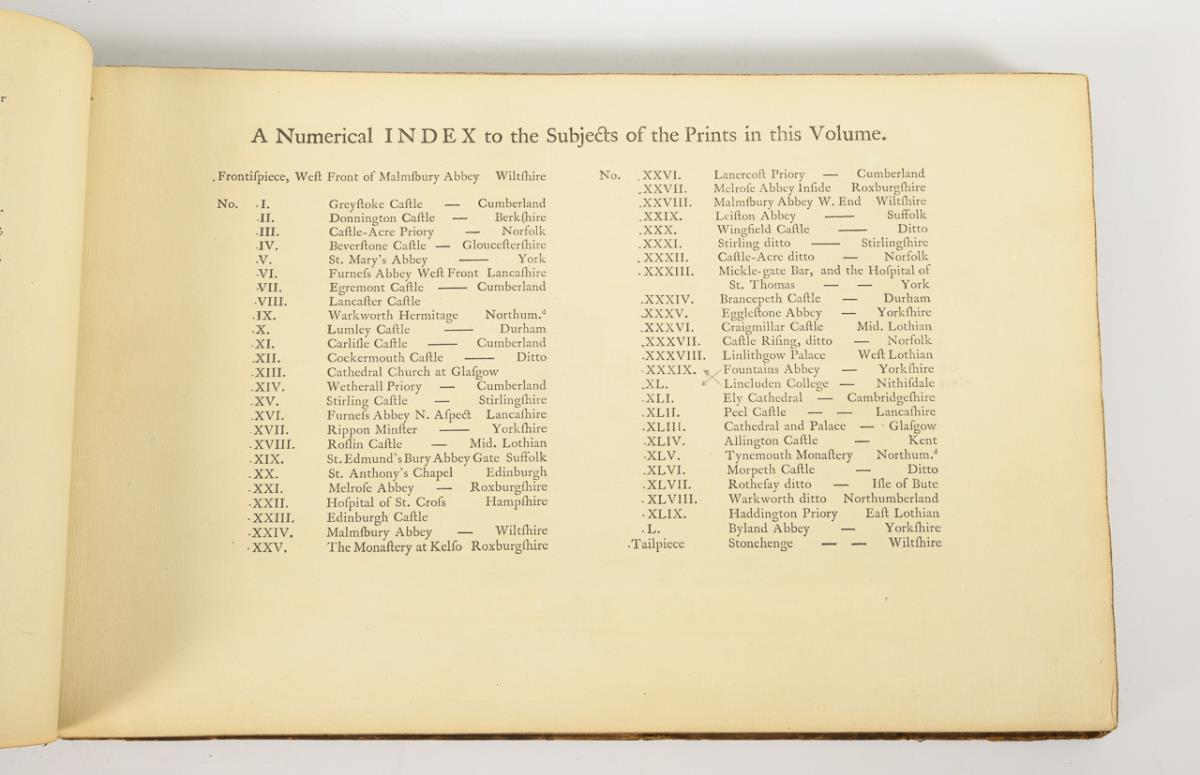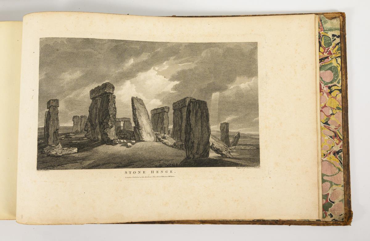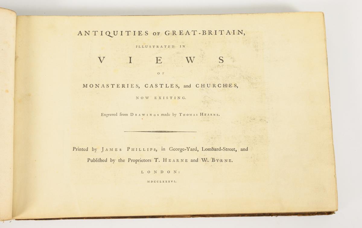 Engraved by W. Byrne and unnamed after drawings by Thomas Hearne. Numerous engravings with detailed descriptions in English and volume two also in French. Both in different leather bindings, one with gilt edges. Complete with 51 and 32 views. One cover loose, faint foxing, signs of age.