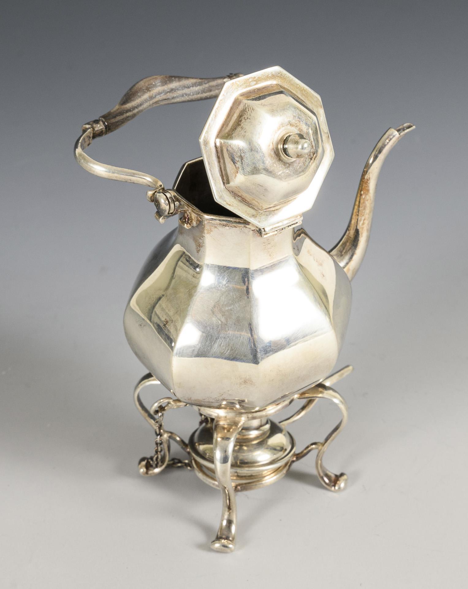 Bellied-faceted form with wooden handle. On a rechaud with burner. Dipped.