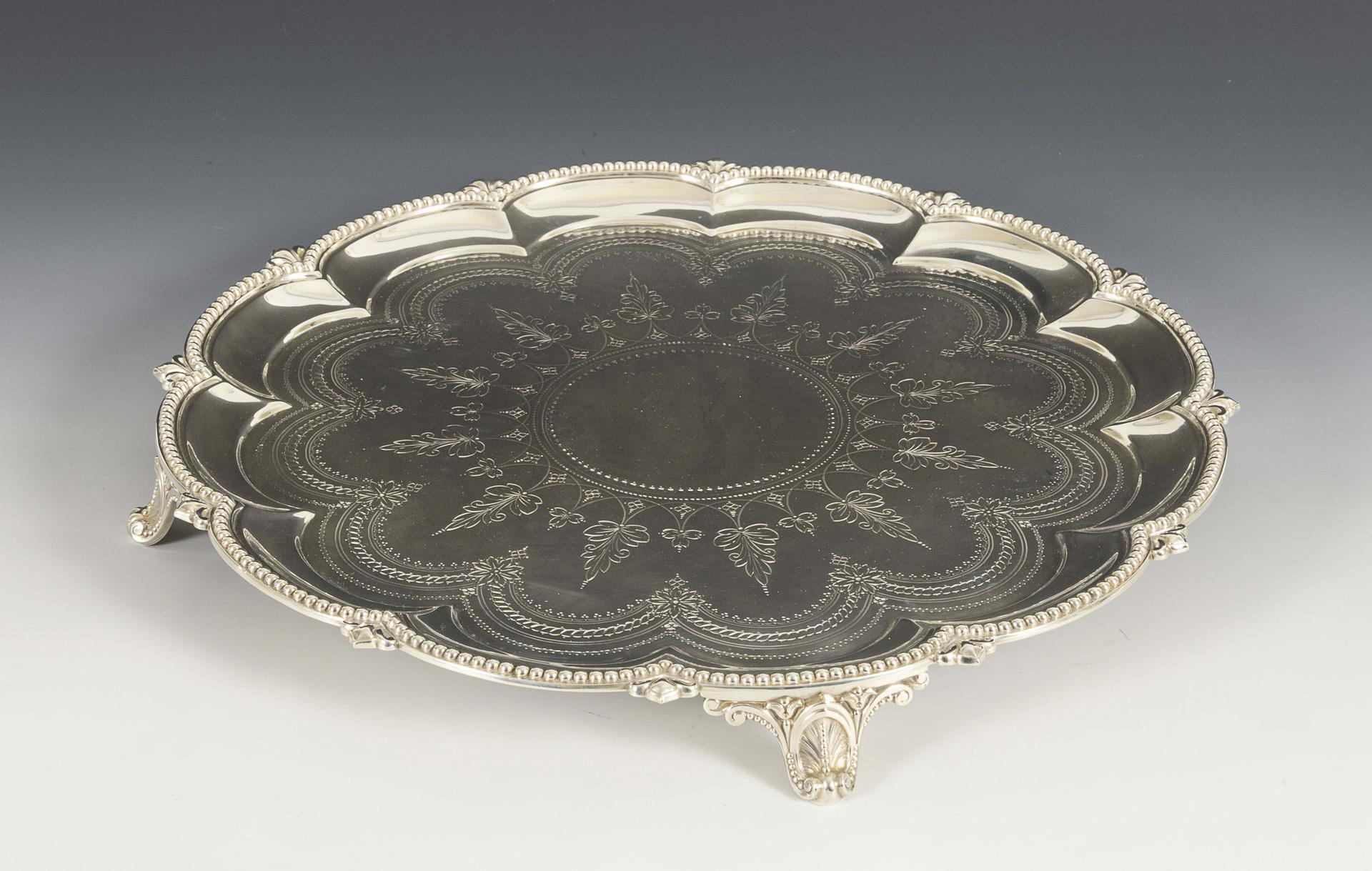 Large salver with floral engravings, on 4 feet in relief. Minimally dented in the mirror.