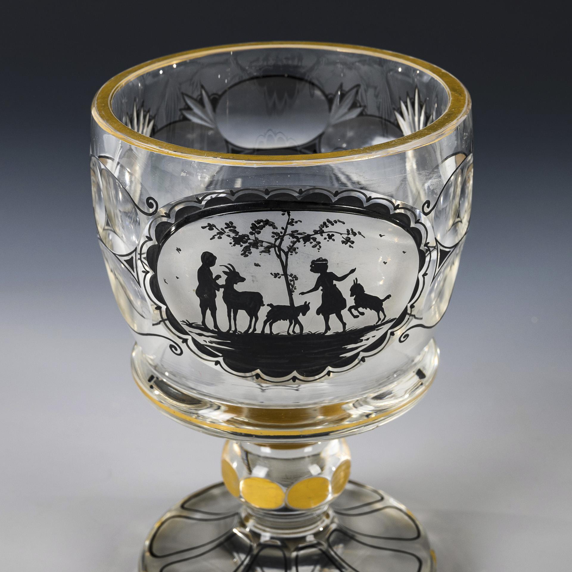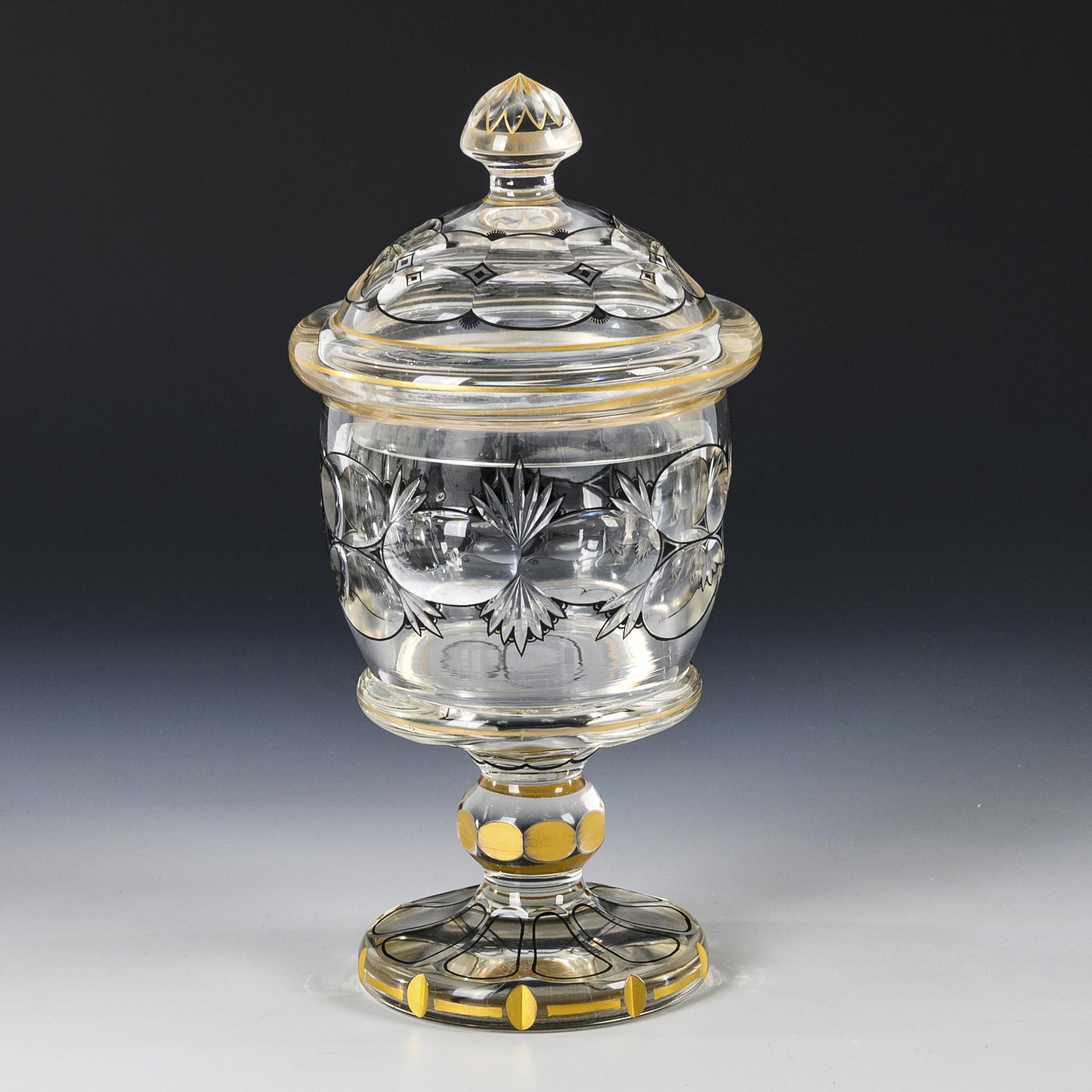 Bellied bowl, faceted at the base with lentil and notch cut, knobbed lid, faceted nodus, round foot. The front with a matt-etched medallion with a silhouette of a pair of children with goats. Minimal gold abrasion.