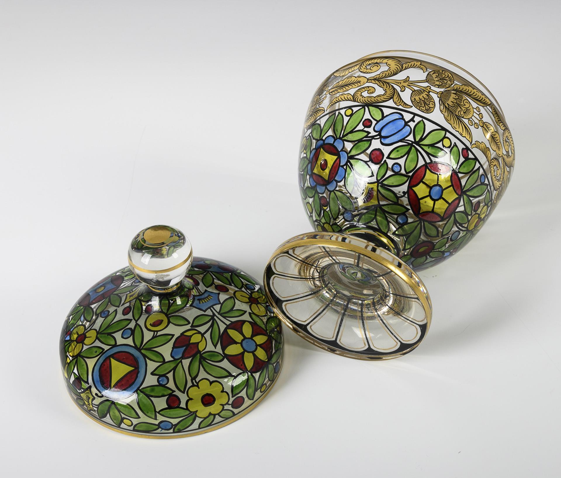 Colorless glass, polychrome enamel painting, black solder, gold decoration. H 22 cm.