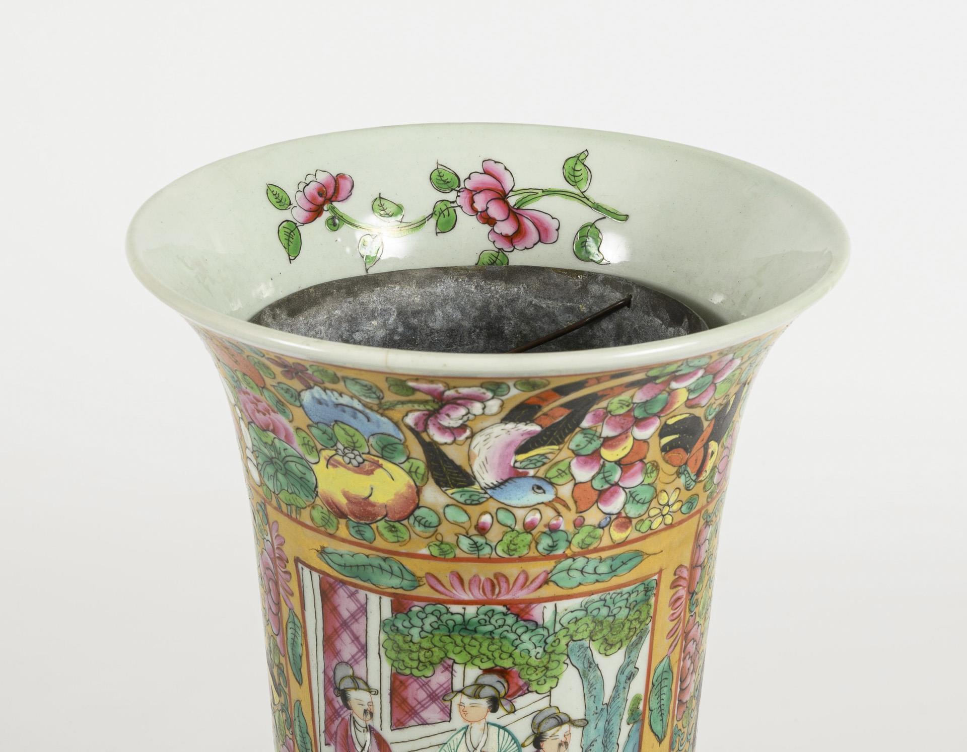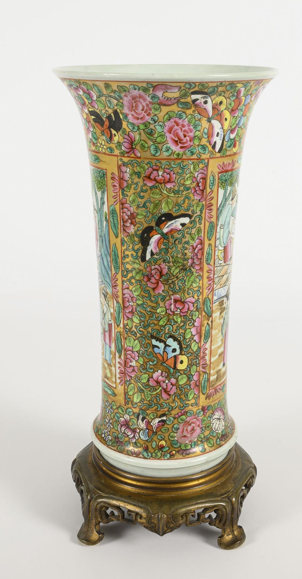 Slim, tall form with figural scenes in two cartouches, framed by floral tendrils. Foot framed with a four-legged metal frame. Metal insert.