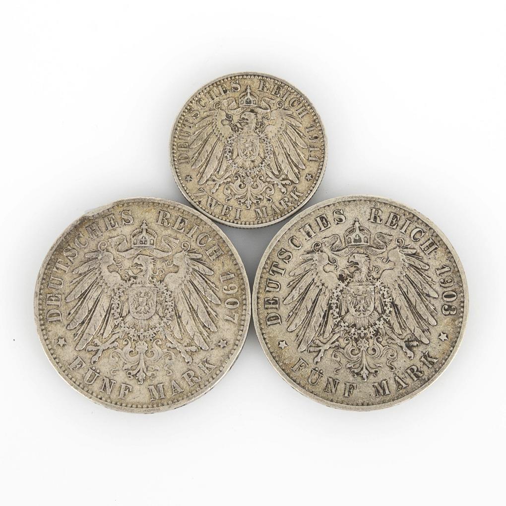 5 Mark 1903 and 1907, as well as 2 Mark 1911. "Freie und Hansestadt Hamburg", all mint J. Condition: very fine.