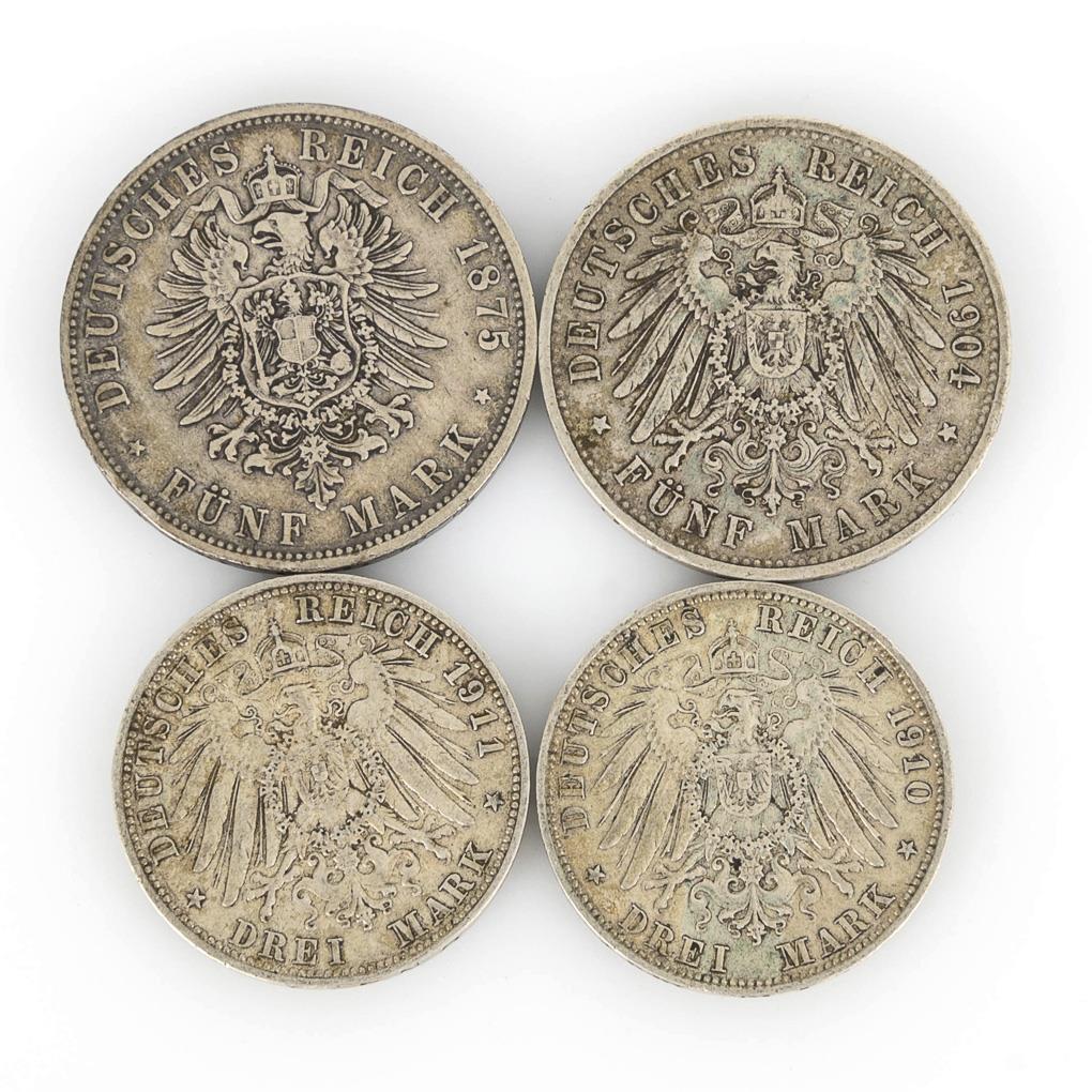 5 Mark 1875, "Ludwig II. Koenig v. Bayern". / 5 marks 1904, "Otto Koenig von Bayern". / 2x 3 Mark 1910 and 1911, "Otto Koenig von Bayern". Condition: very nice.