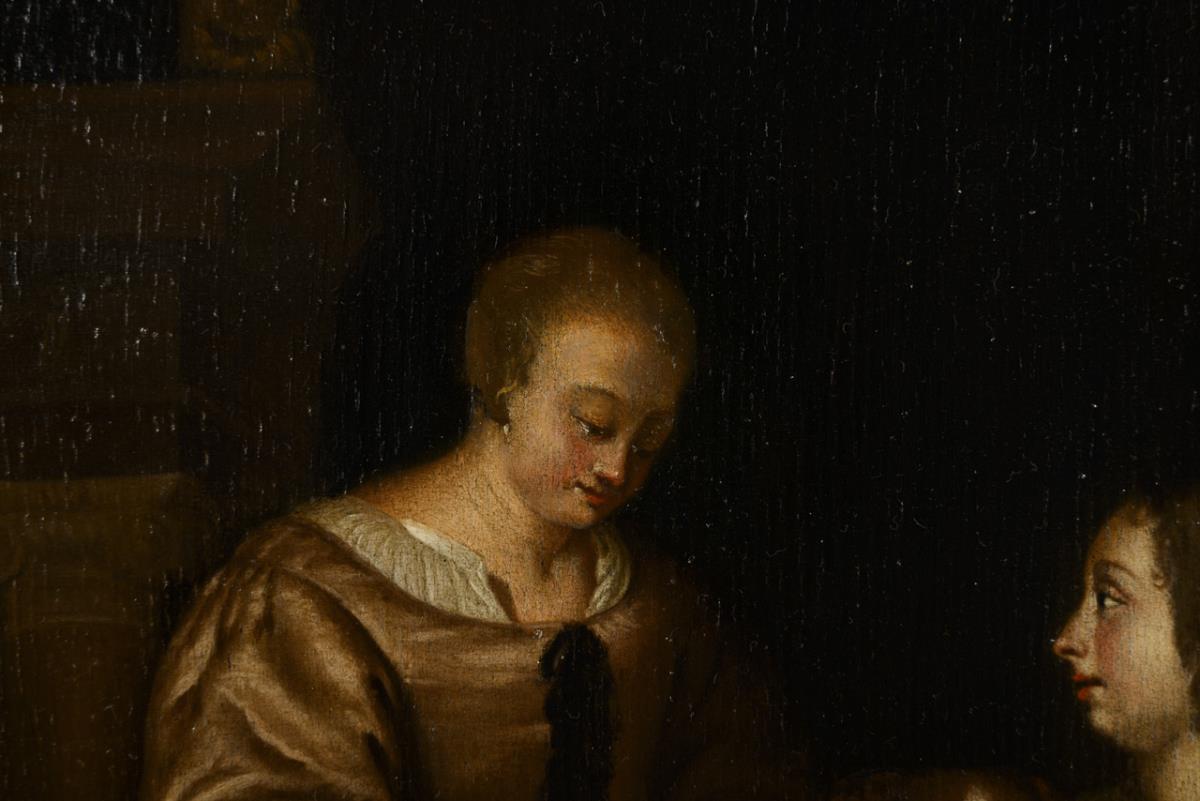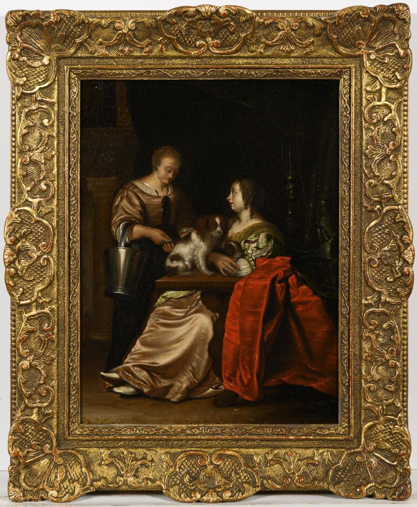 High-quality depiction of a young woman in a silk dress with a maid and a dog at a table. Slight traces of age.