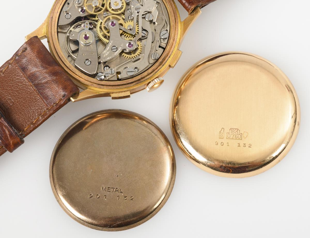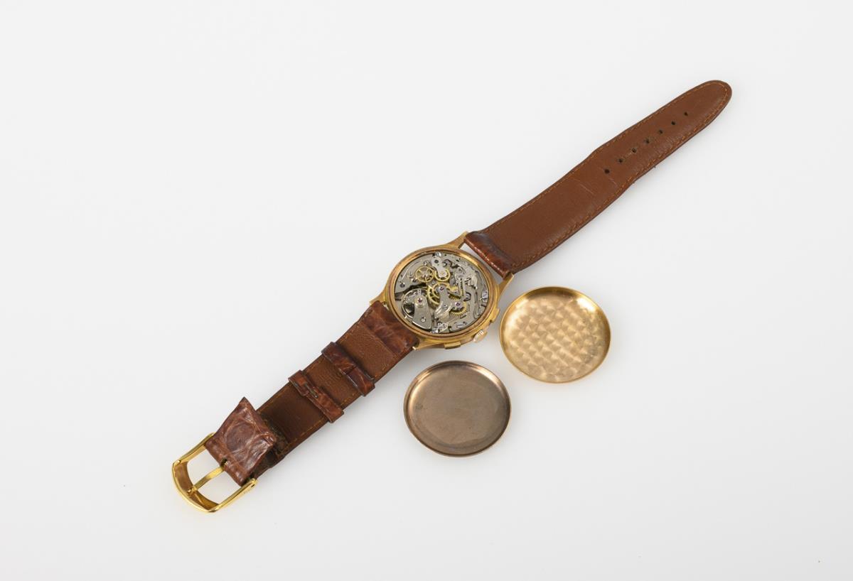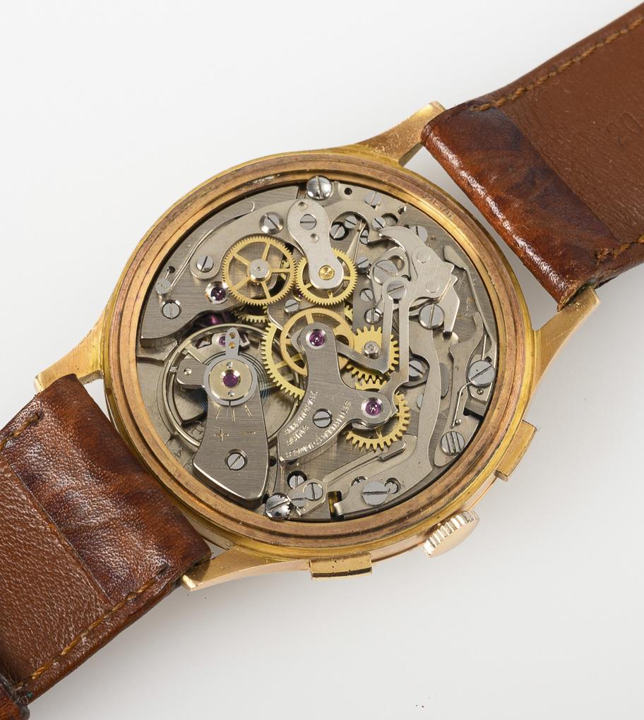 Mechanical movement with crown winding. Functional in short time test. Brushed gold-colored dial, with hour markers and Arabic numerals, minute ring with telemeter scale in red and blue, subsidiary dials for small second and 30-minute display, Dauphine hands, stop function with 2 setting buttons.