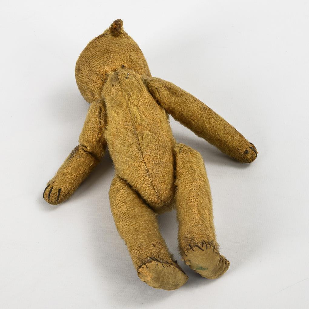 Small, bald teddy bear with black shoe-button eyes. Comes with correspondence between the consignor and the Steiff Museum in Giengen about the teddy bear. Heavily worn, eyes probably replaced, several repairs.