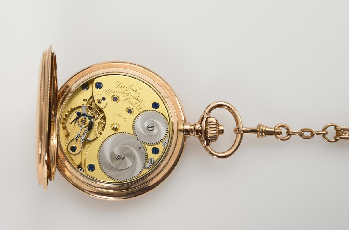 "Deutsche Uhrenfabrikation Glashütte" marked and grained gilt 3/4 plate movement with lever escapement, compensation balance with regulating screws, swan-neck fine adjustment, blued Breguet balance spring and blued screws, crown winding. Functional in the short-term test. White enamel dial with company lettering, Arabic numerals, minute ring, small second and Louis XV gold hands.