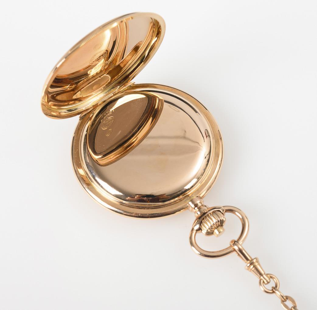 585 hallmarked, hallmark of fineness, Swiss hallmark, ALS company mark. Ø 5.6 cm, L 29 cm. Watch 119 g, chain 29 g.