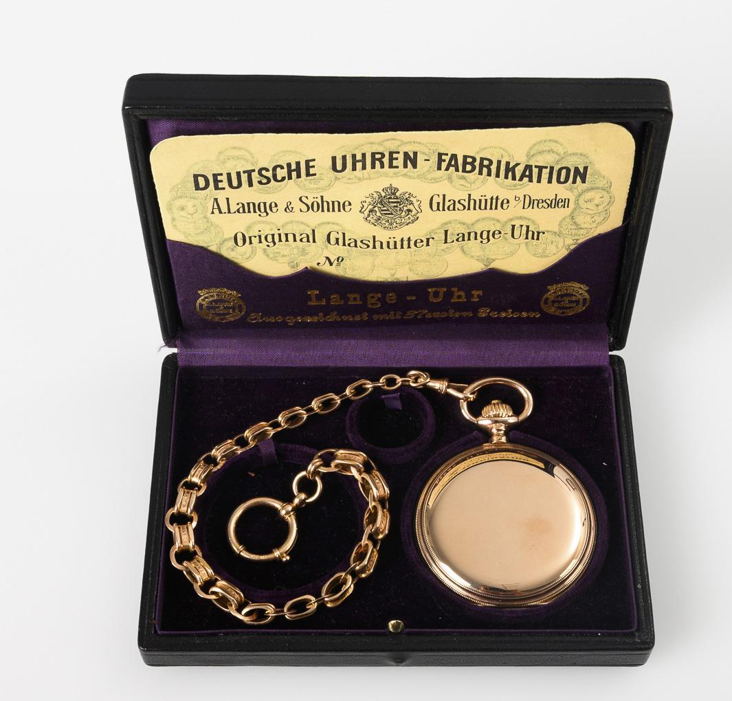 Gold men's pocket watch with watch chain in case. A. Lange & Söhne, Glashütte.