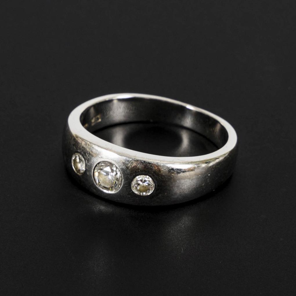 Wide gradient band with 3 embedded brilliant-cut diamonds. Wear marks.