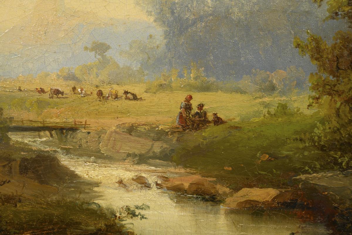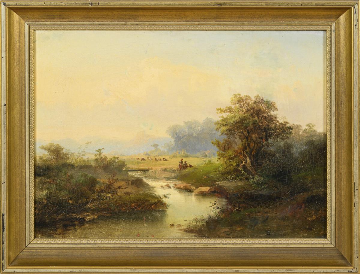 Stream on a wide meadow plain with cattle and a couple in conversation in front of the forest. Traces of age.