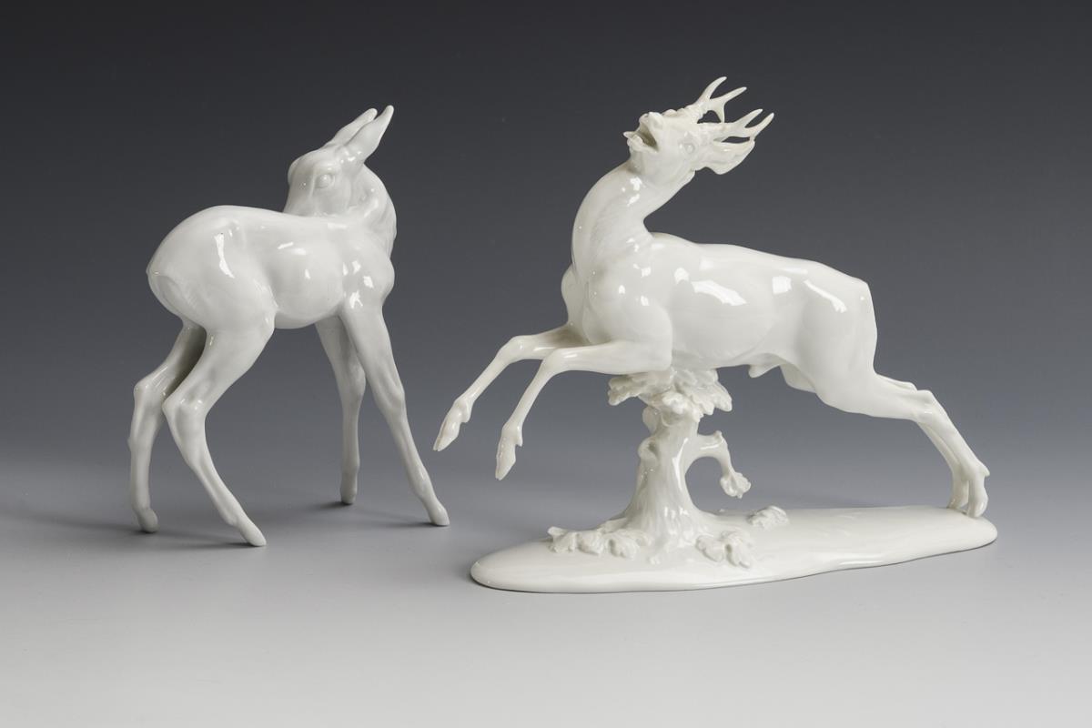 1x roebuck, model no. B 249, design around 1924/25 by Theodor Kärner (1884-1966), marked (H 16 cm). / 1x fawn, without model no., design 1938 by Willi Münch-Khe (1885-1960), inscribed (H 14.5 cm).