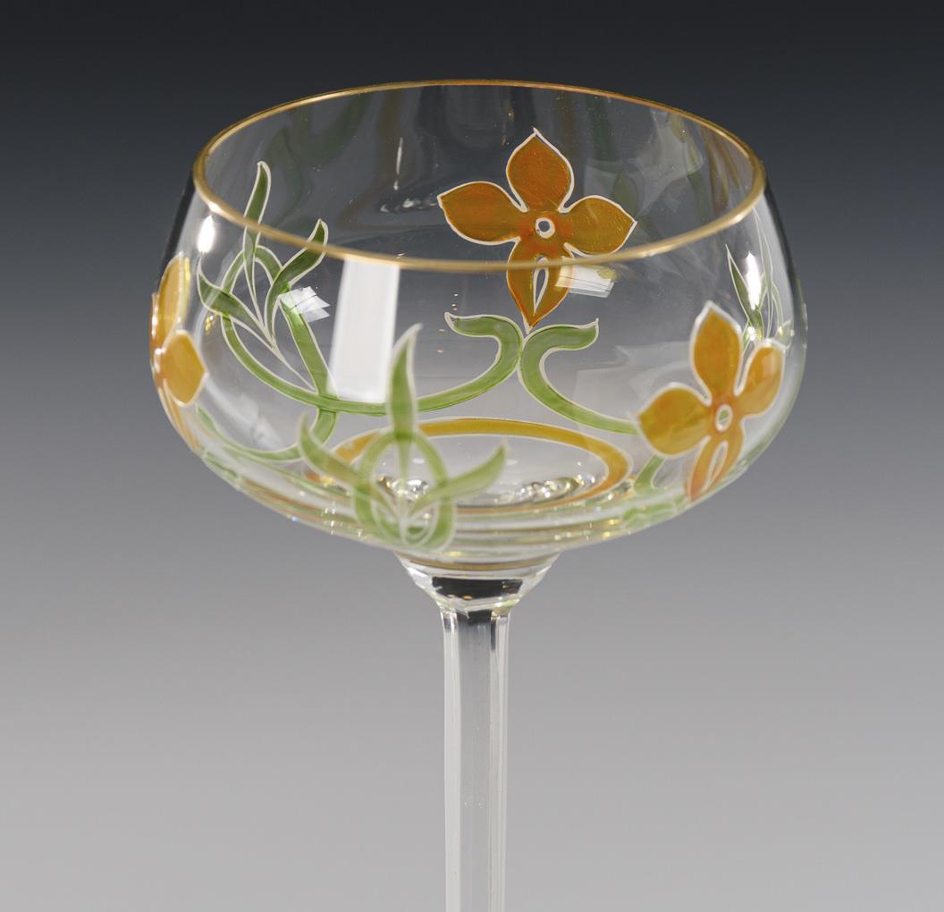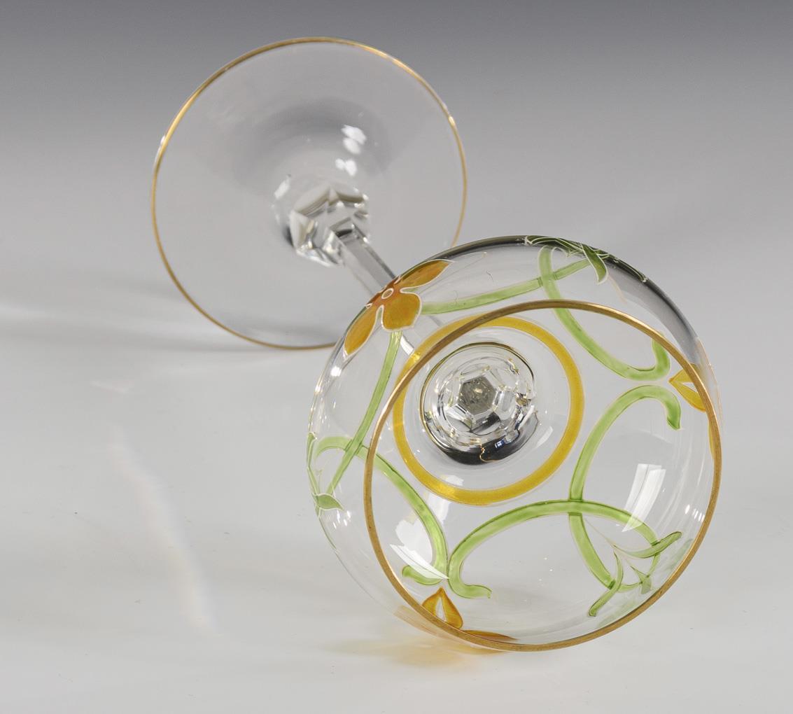 Broad-bellied bowl, six-faceted stem, round base. On the dome a stylized floral decoration in yellow and green transparent enamel, outlined with white opaque enamel.