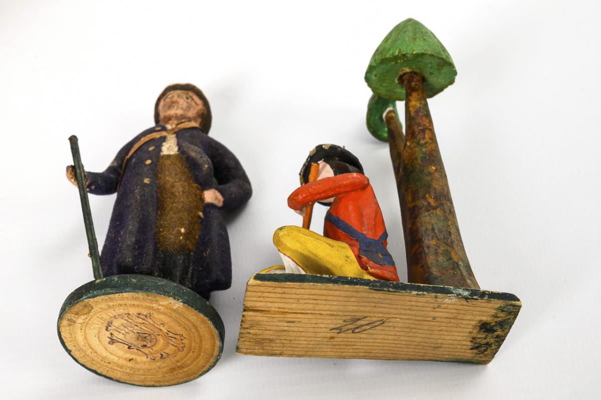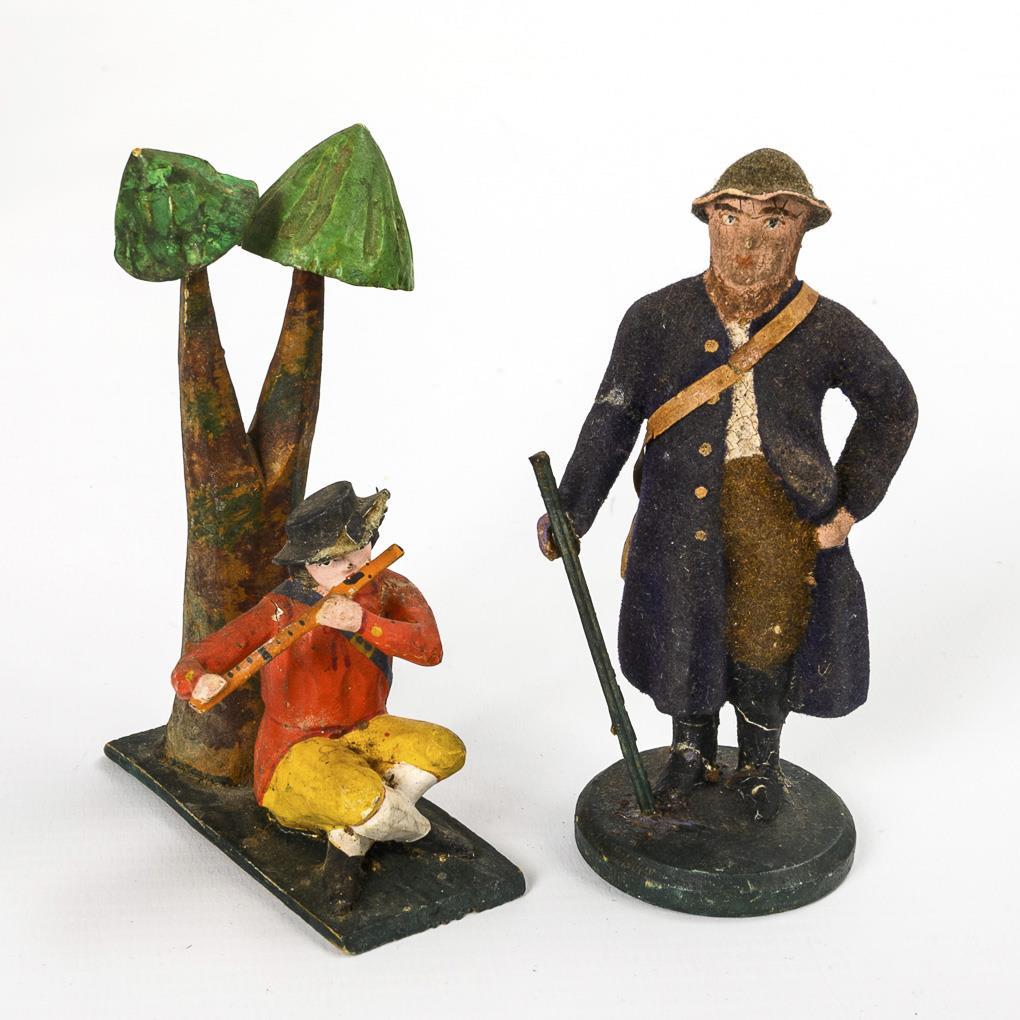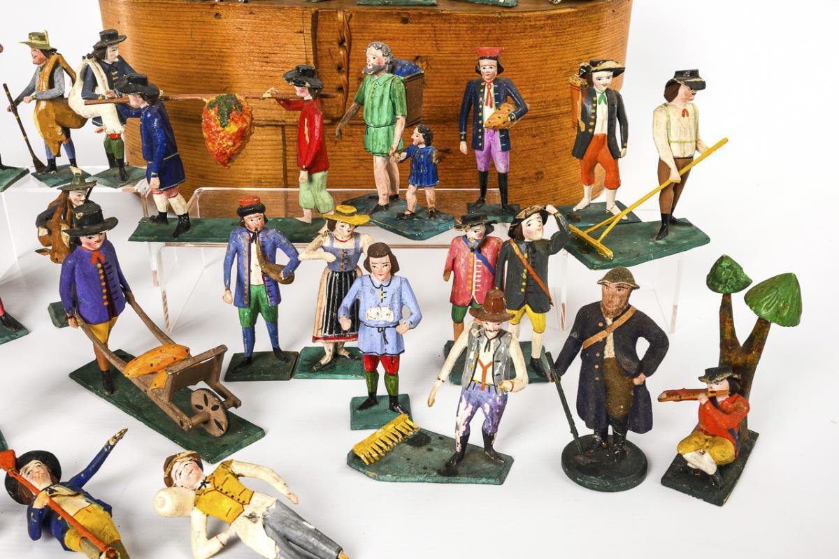 Approx. 20 hand-carved and modeled figures, including gift bringers, hunters, farmers etc. and 18 sheep. In oval chip box (16.5 x 42.5 x 27.5 cm). With defects and missing parts.