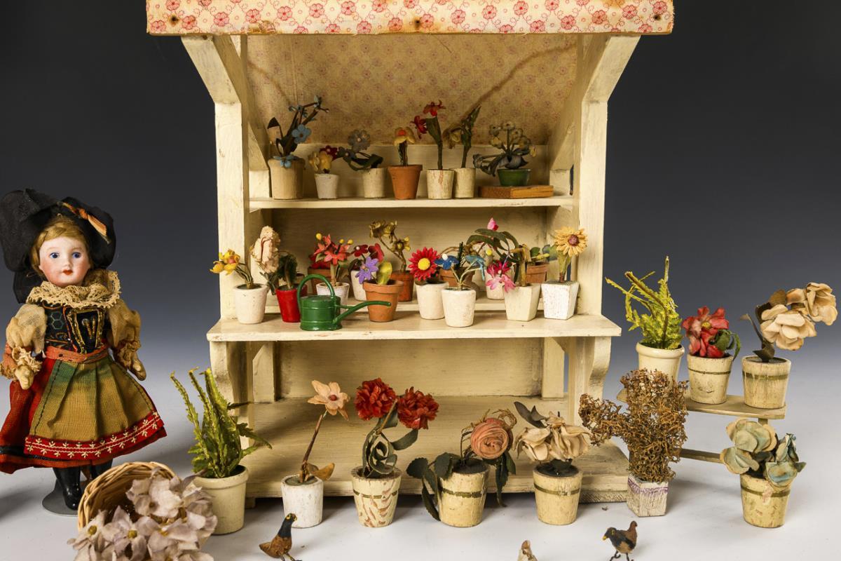 Market stall with numerous textile flowers, bench, 2 watering cans and porcelain head doll as saleswoman (Unis France, L 13.5 cm). Original condition, signs of age, minor defects.