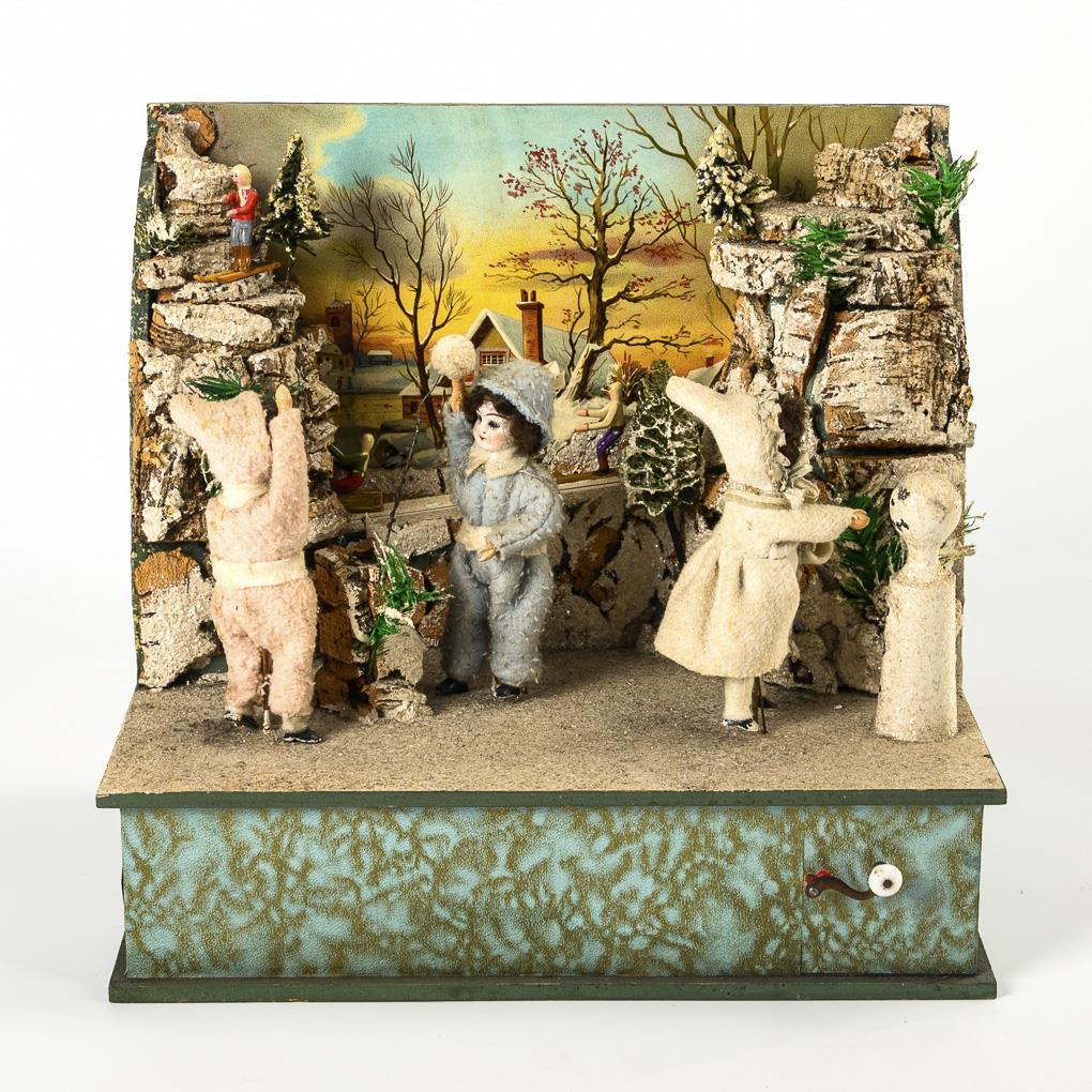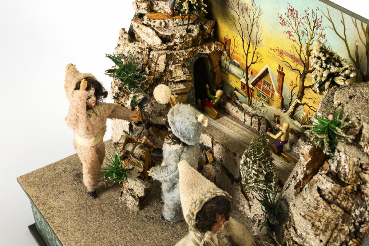 In the style of Gottlieb Zinner. Small scene with moving figures, 2 rocks and lithographed background image. Intact work with hand crank, plays "O du Fröhliche".