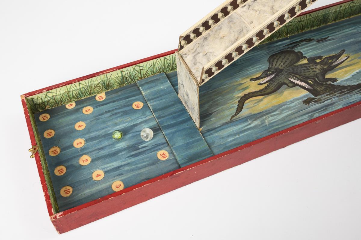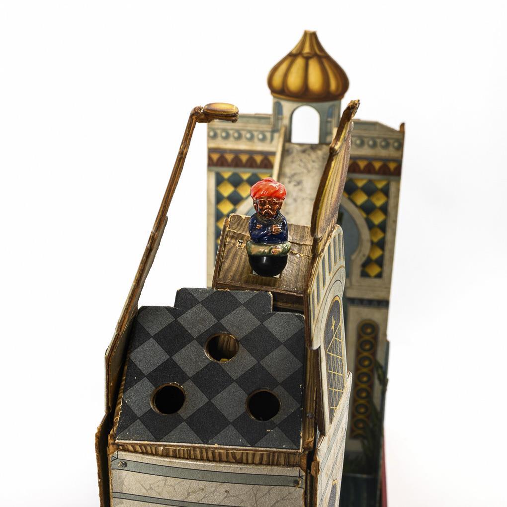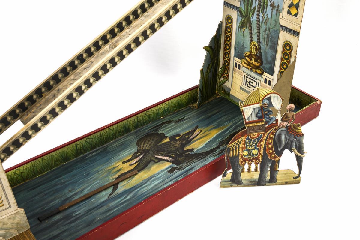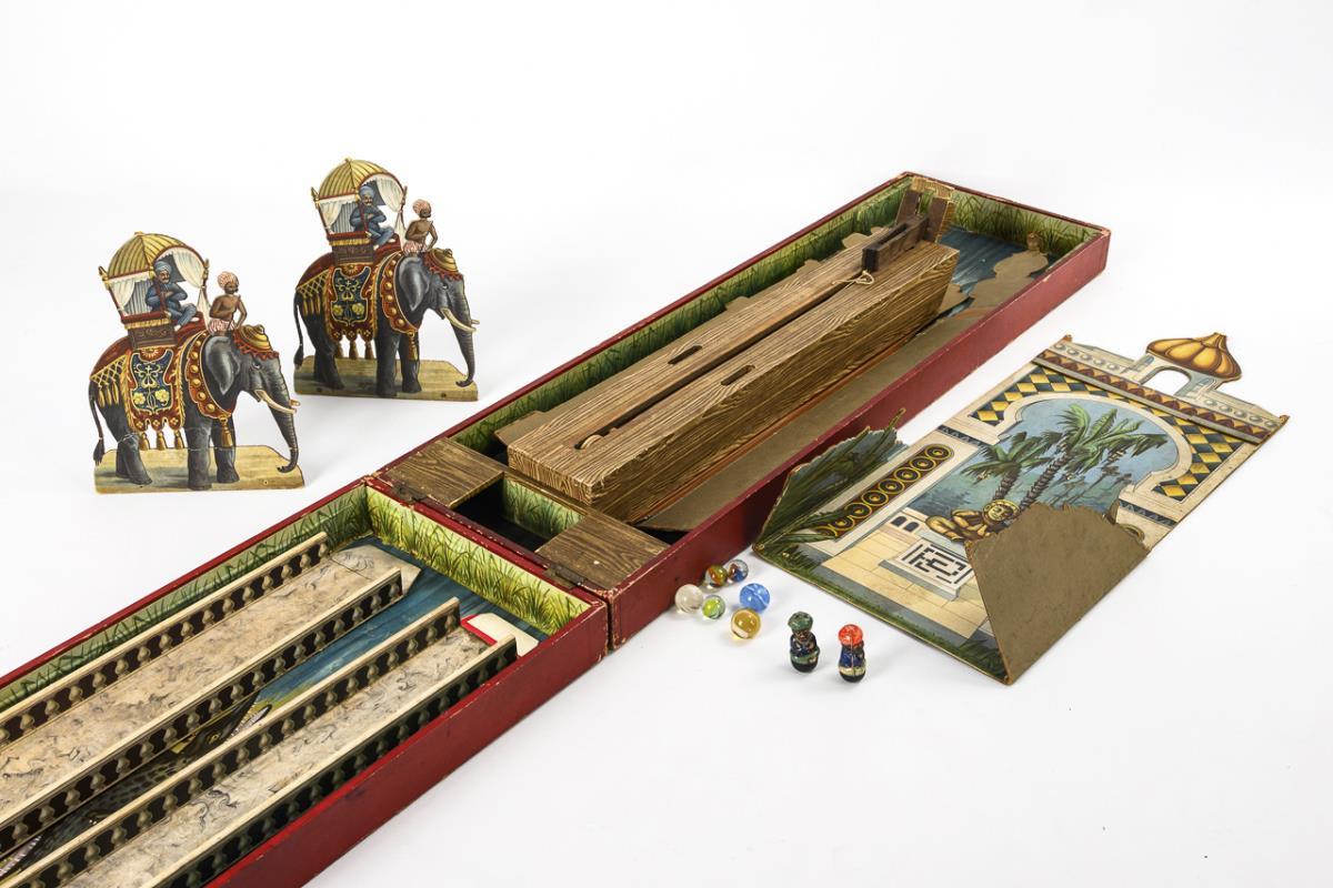 Rare ball game. Set in the shape of an Indian palace and two elephants. Comes with 2 small original celluloid game pieces and some glass marbles. Signs of age, minor defects, completeness not checked.