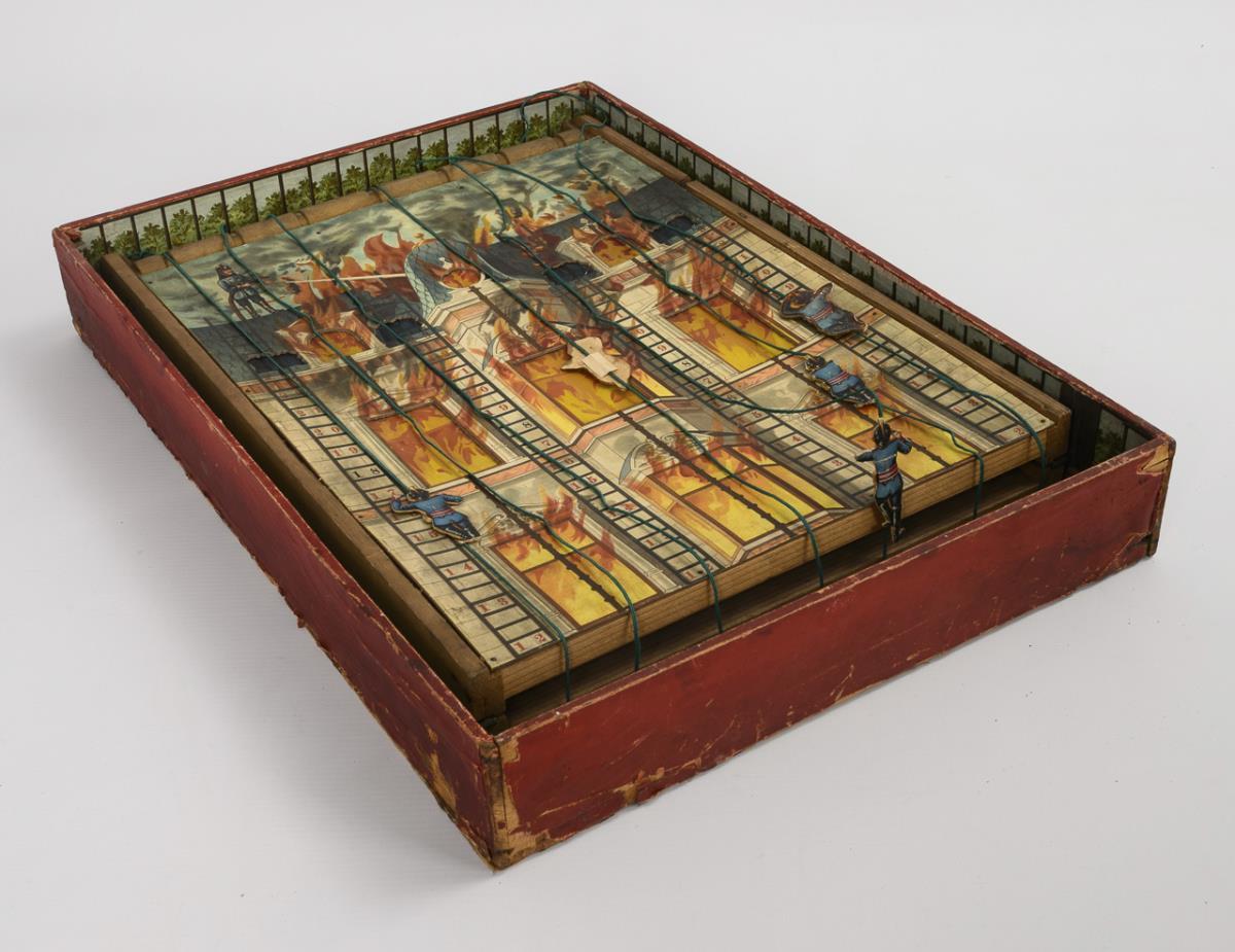Extremely rare game with burning house, insertable trees, cardboard numbers (1-7) and 1 die. In defective cardboard box. Signs of age and defects, some number cards replaced.