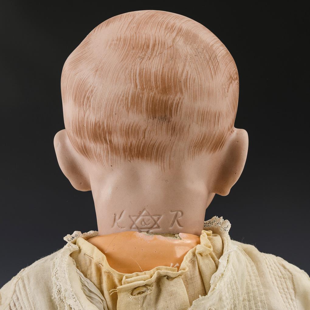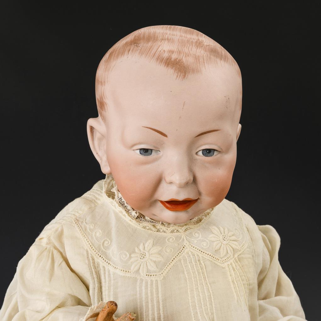 So-called "Kaiserbaby" with full head, painted blue eyes, open/closed mouth, painted hair. 5-part sitting baby body and several white clothes. Hands rubbed, 2 fingers bumped.