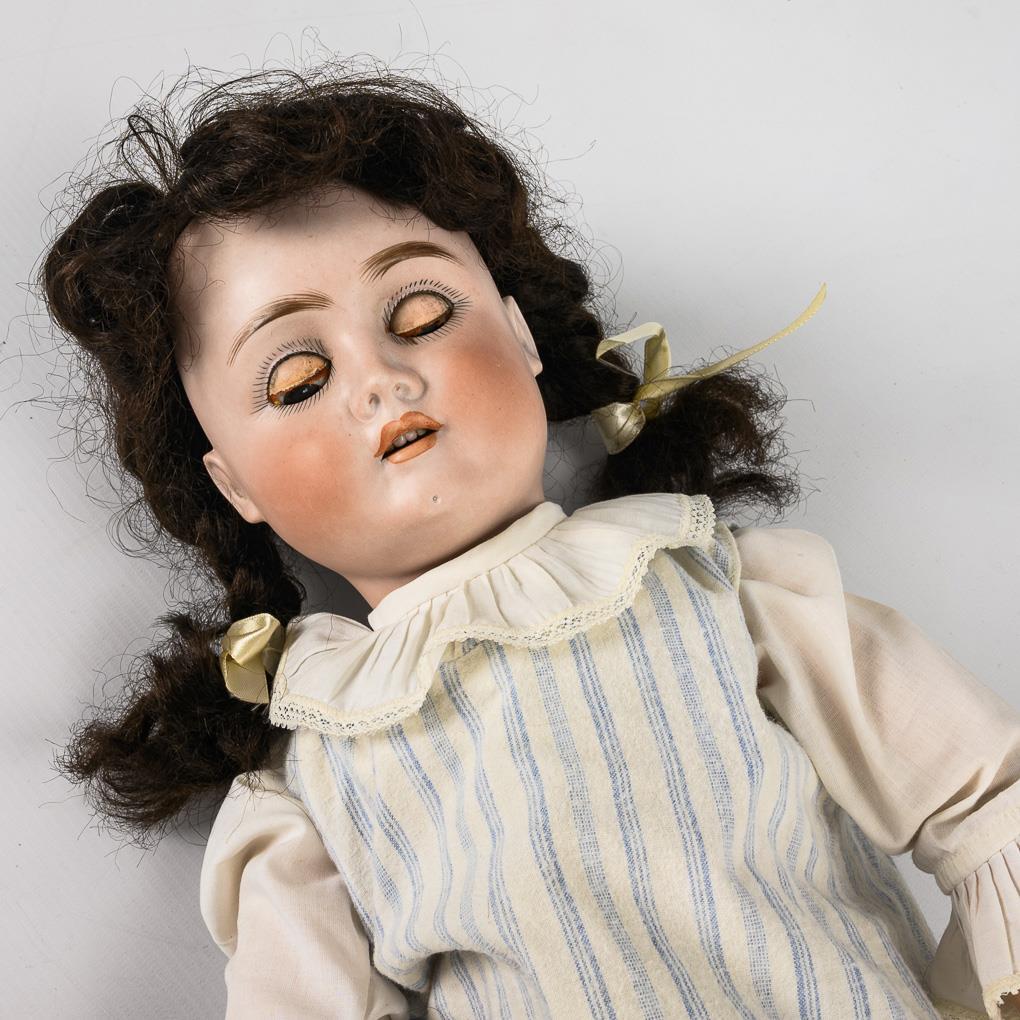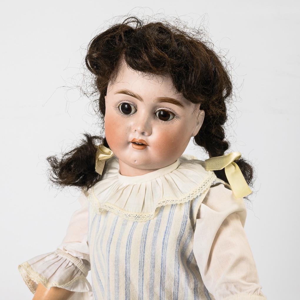 Cranked head, dimpled chin, brown sleeping eyes, dark brown mohair wig. 15-part articulated body with raised knees. White dress with blue stripes, old brown leather shoes. Head x-rayed: without defects. 1 foot and 2 fingers retouched.