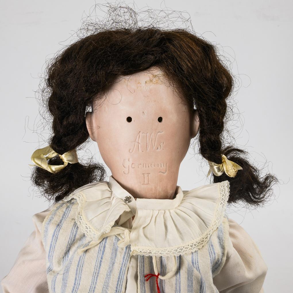 Porcelain head doll with striped dress. Adolf Wislizenus.