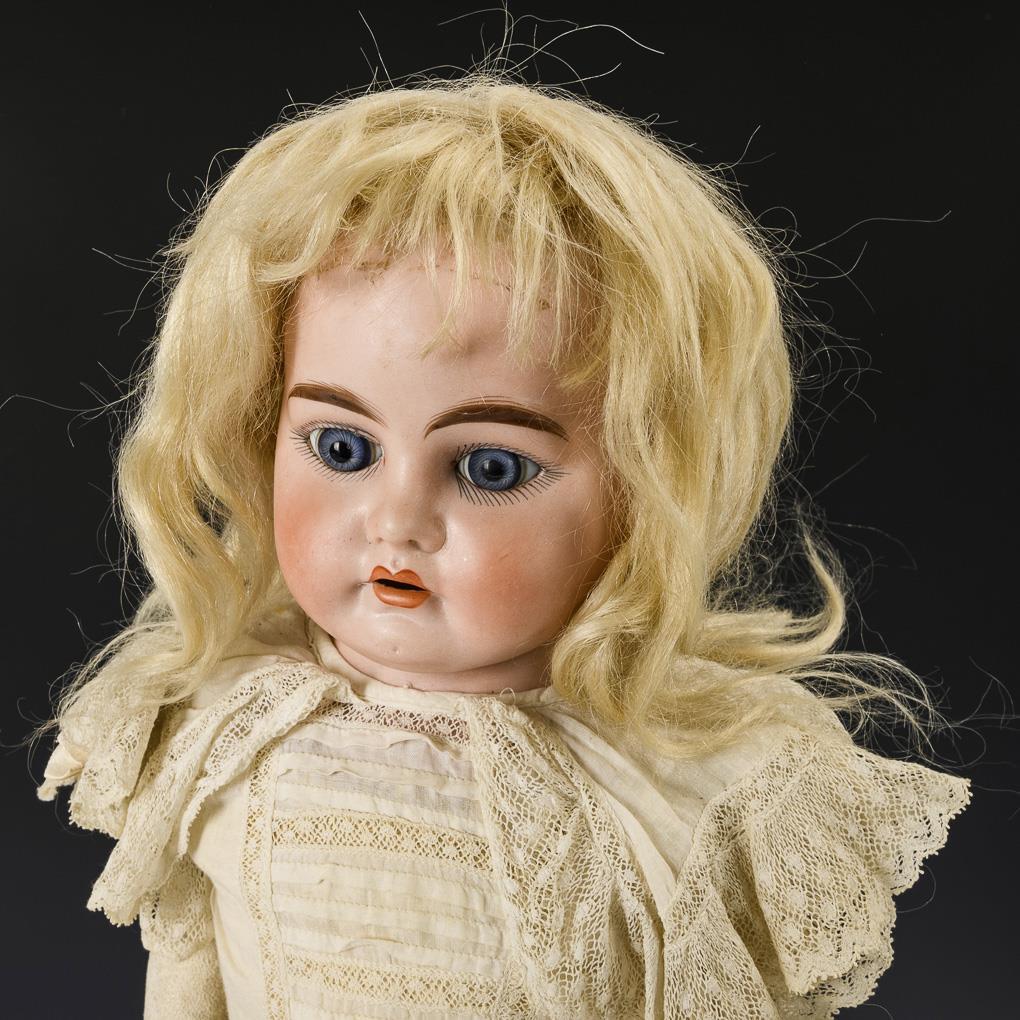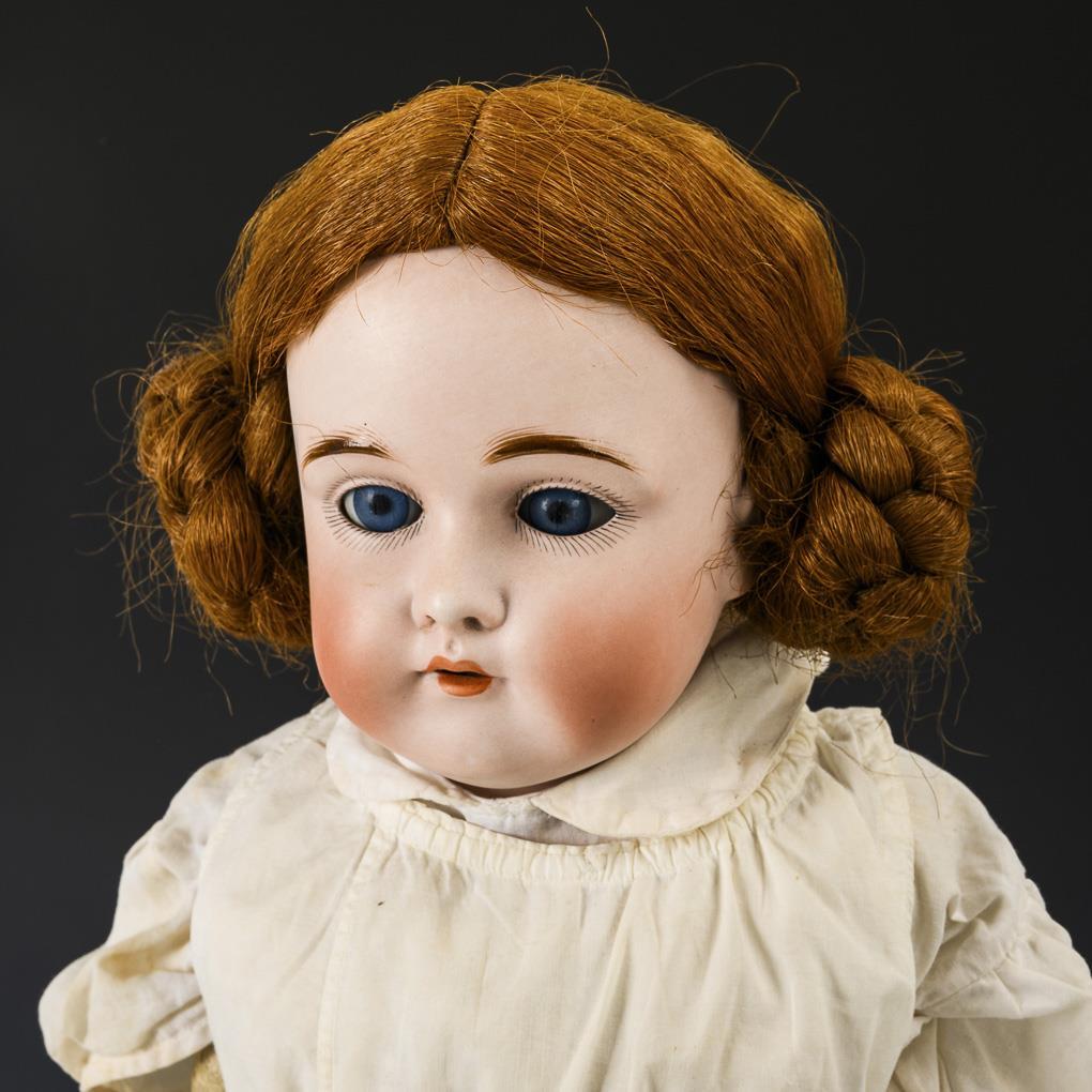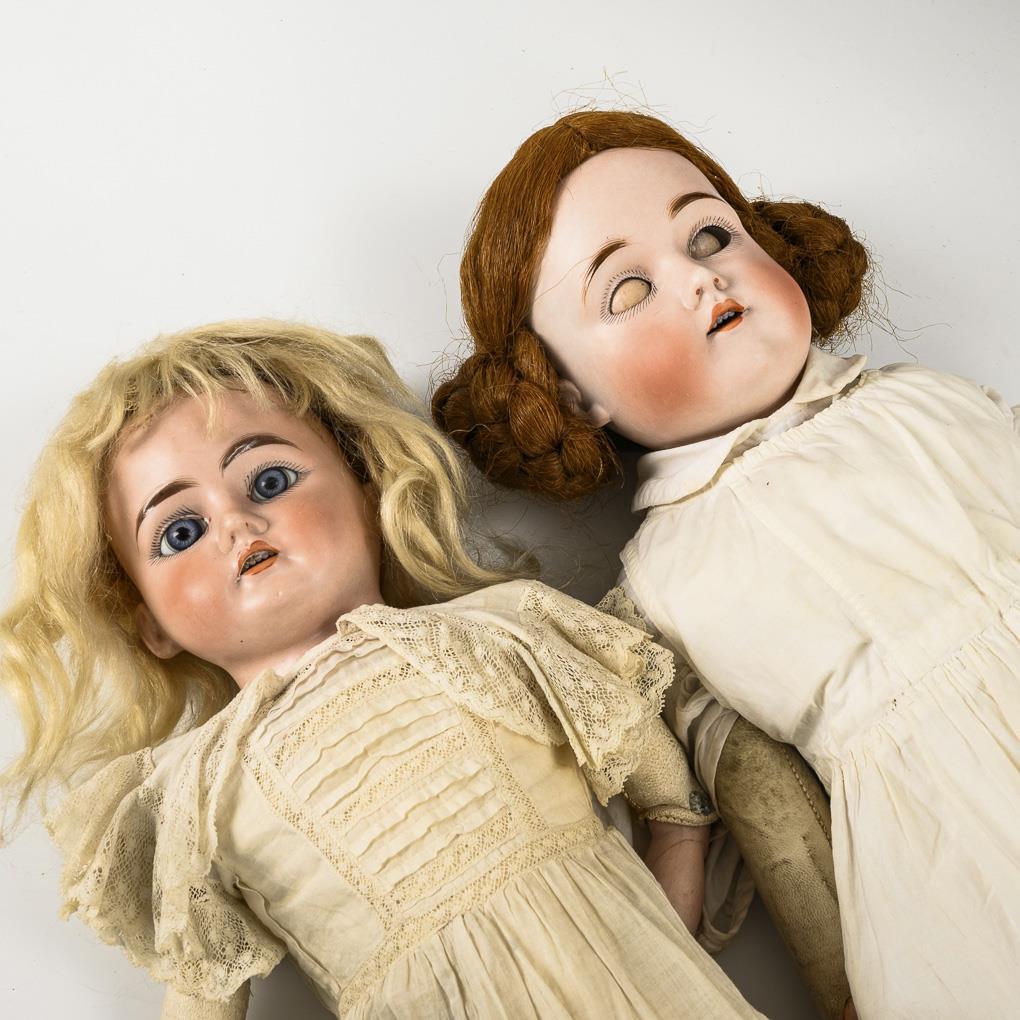 Kestner girl (166) with blue, slightly sunken sleeping eyes, red-brown human hair wig with scroll hairstyle and leather body with split mass links. L 63 cm. Blonde doll with blue glass eyes, blonde mohair wig, leather body and bisque porcelain forearms. 2 hairline cracks in the chin area, left arm with repairs. L 53 cm. Each in a white dress.