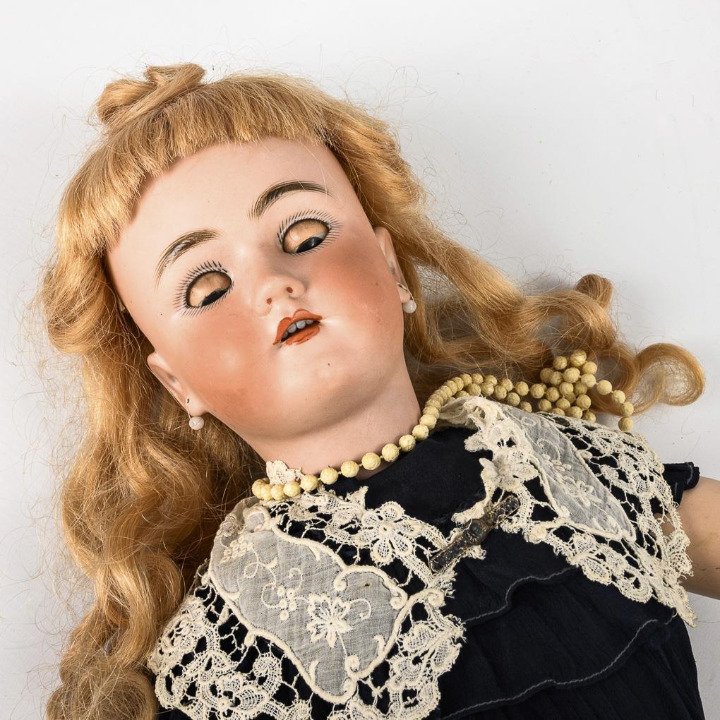 Cranked head, brown sleeping eyes, earrings, long human hair wig. 15-piece articulated body. Dark blue dress with white lace collar, brown leather shoes. Head x-rayed: without defects. Hands slightly different.
