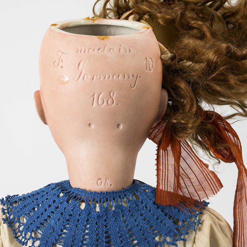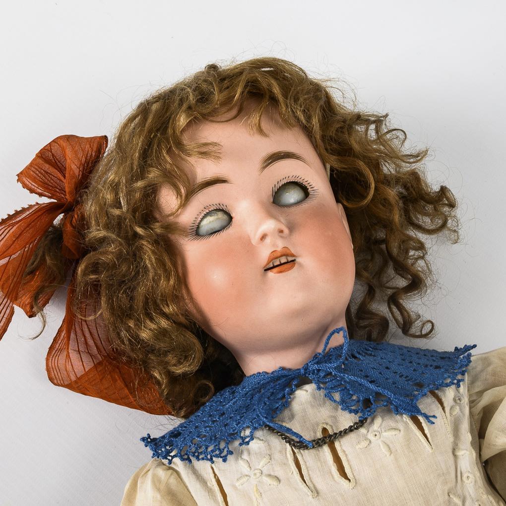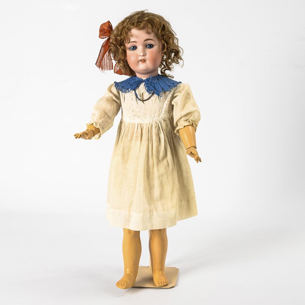 Cranked head, blue sleeping eyes, dark blond mohair wig. 15-part jointed body, with red stamp "Germany 3392". White dress, blue collar. Head x-rayed: without defects. Body painted over.