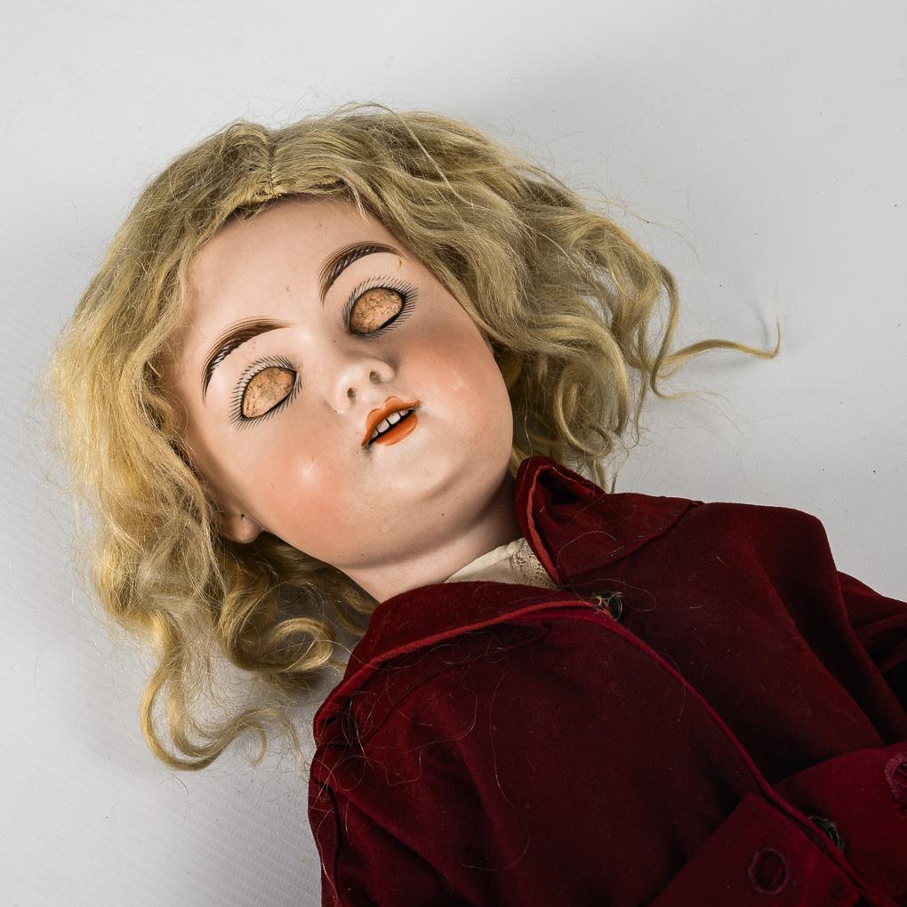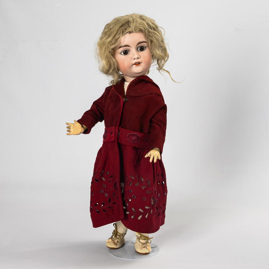 Cranked head, brown sleeping eyes, pierced ears, mohair wig. 13-part jointed body. Coat dress with perforated embroidery, white leather shoes. Head x-rayed: without defects, only minimal chips to the head crank. Left arm with 2 fine cracks.