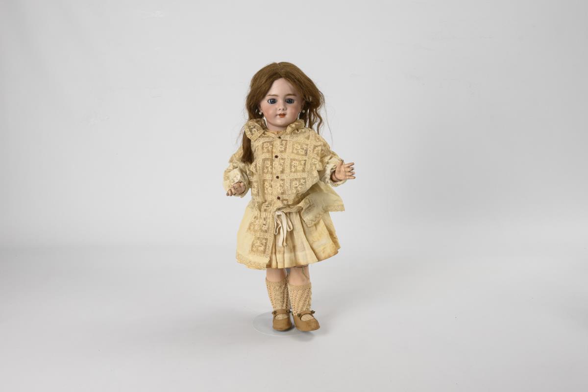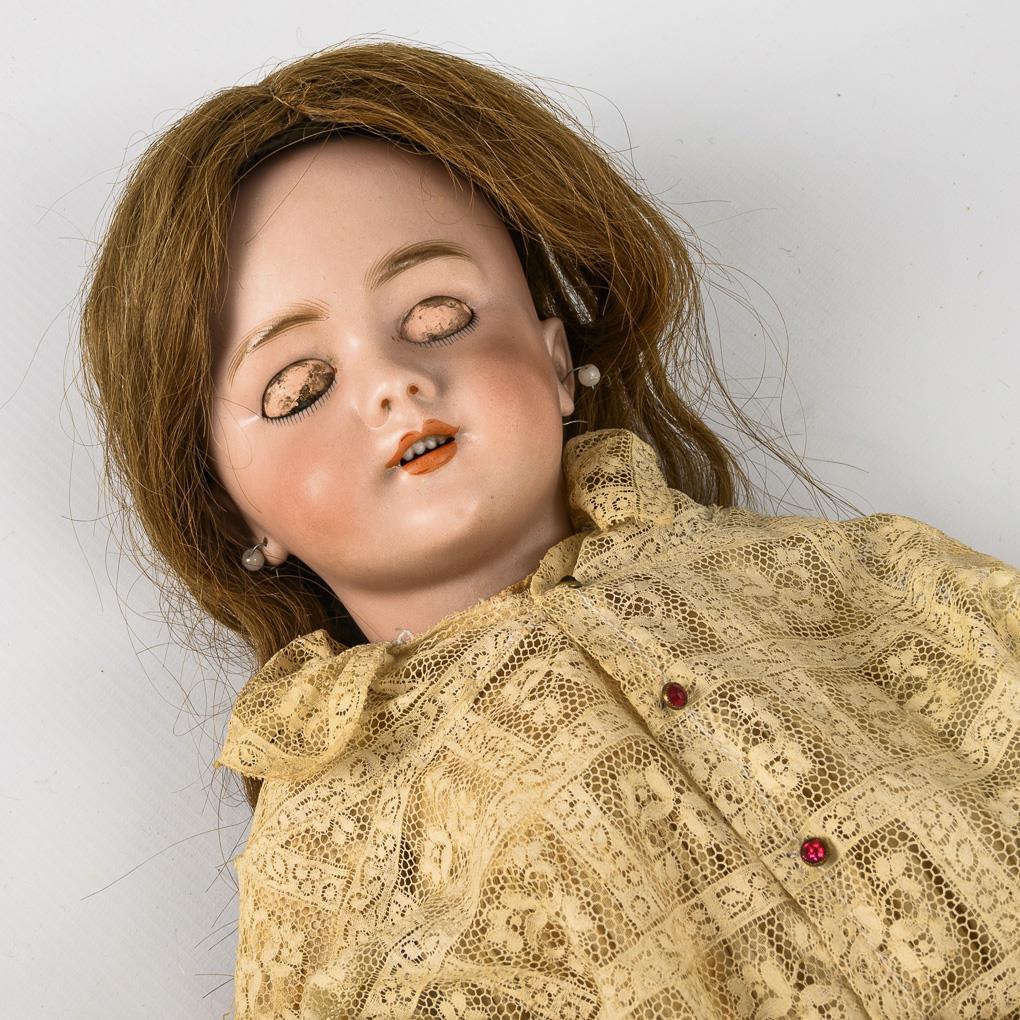 Cranked head, blue sleeping eyes, earrings, brown real hair wig. 11-piece articulated body with soft voice. Cream-colored dress, light brown leather shoes. Head x-rayed: without cracks, only tiny chip on upper left eye rim. Body with color defects.