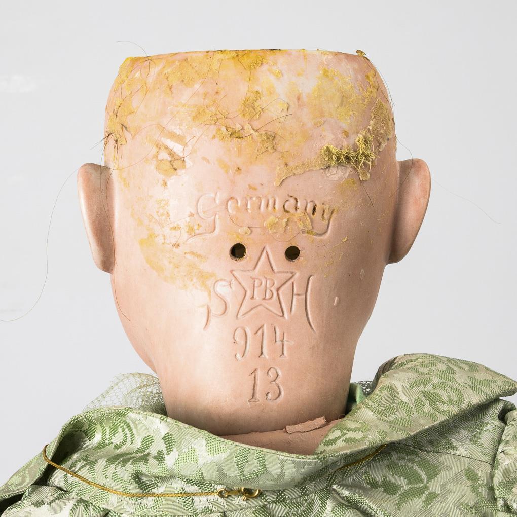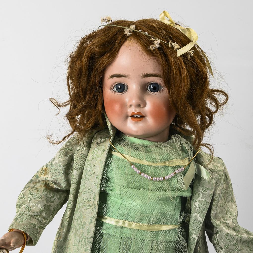 Large doll with green dress and tin suitcase. Schoenau & Hoffmeister.