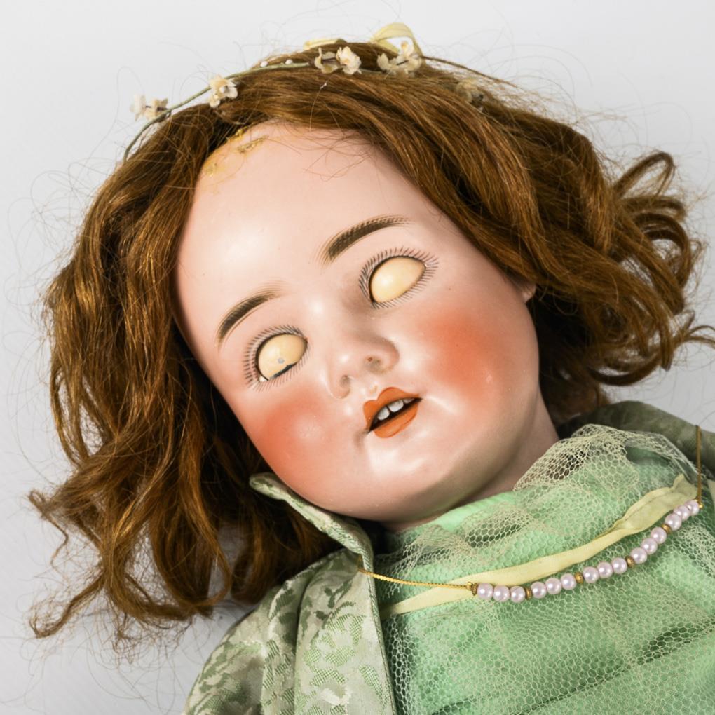 Cranked head, blue sleeping eyes, brown real hair wig. 15-part jointed body. Long dress, coat, pearl necklace and sandals. Head x-rayed: no defects. Body painted over. Comes with a small tin case, lithographed in wood look (16 x 22 x 10 cm).
