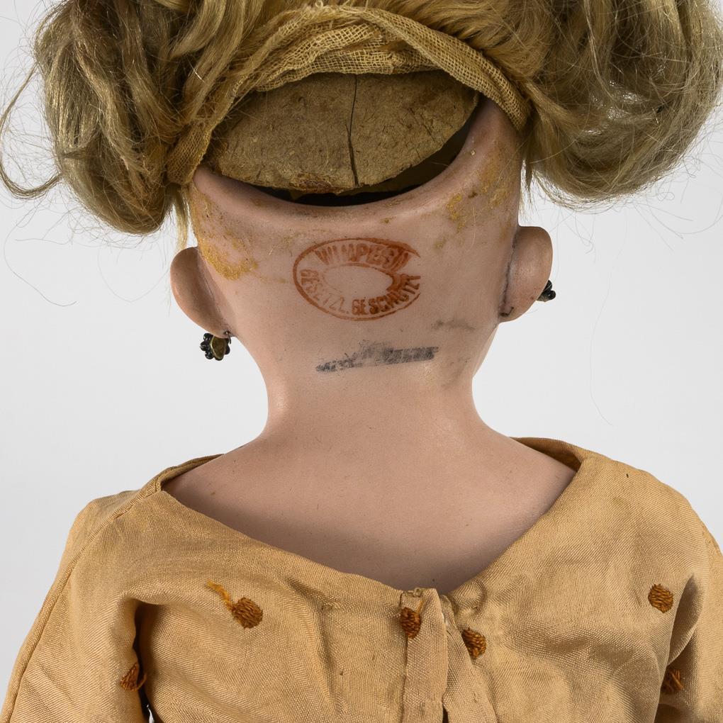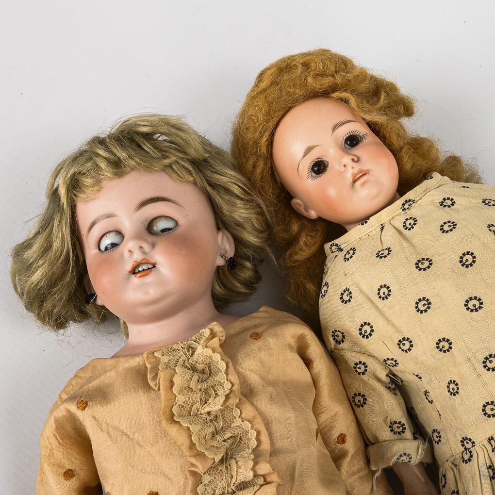 1x Simon & Halbig (SH marked) with blue sleeping eyes, earrings, mohair wig, leather body and salmon-colored dress. L 44 cm. / 1x with fixed brown eyes, open/closed mouth, synthetic hair wig, leather body with bottom and knee gussets and light dress with stylized flowers. L 39 cm. Heads without visible defects (1x x-rayed), several fingers bumped.