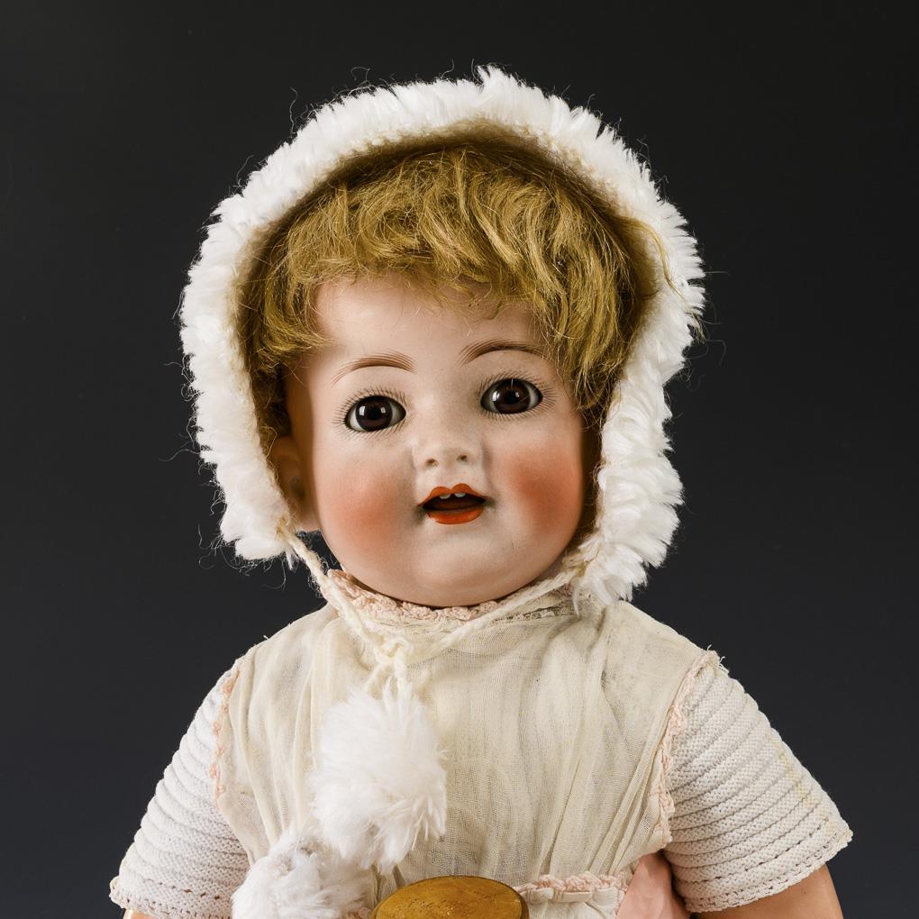 Cranked head, brown sleeping eyes, blonde mohair wig, 5-part sitting baby body with voice. Long white dress with pink bow, white crocheted cap. Head x-rayed: without defects. 2 fingers bumped. Comes with wooden rattle.