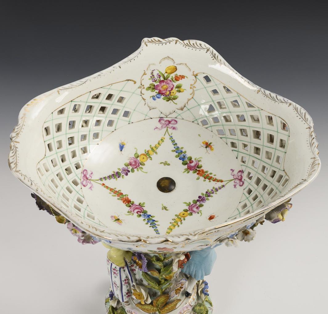 Richly flower-covered, quatrefoil bowl with flower painting, on a flower-covered tree trunk shaft with a pair of gardeners standing on the shaft, six-pass base with grillage opening. Hairline crack in the bowl, gold partly rubbed, chips to the covering.