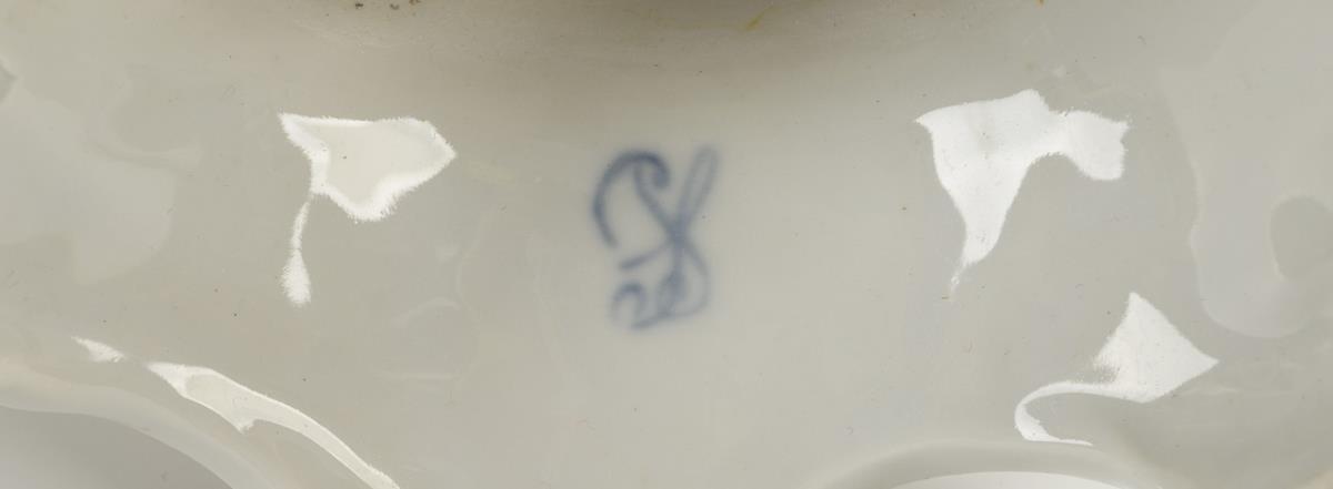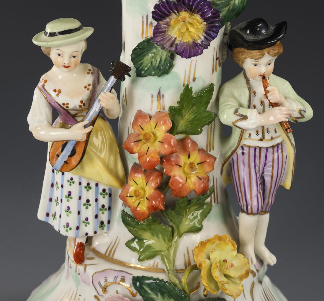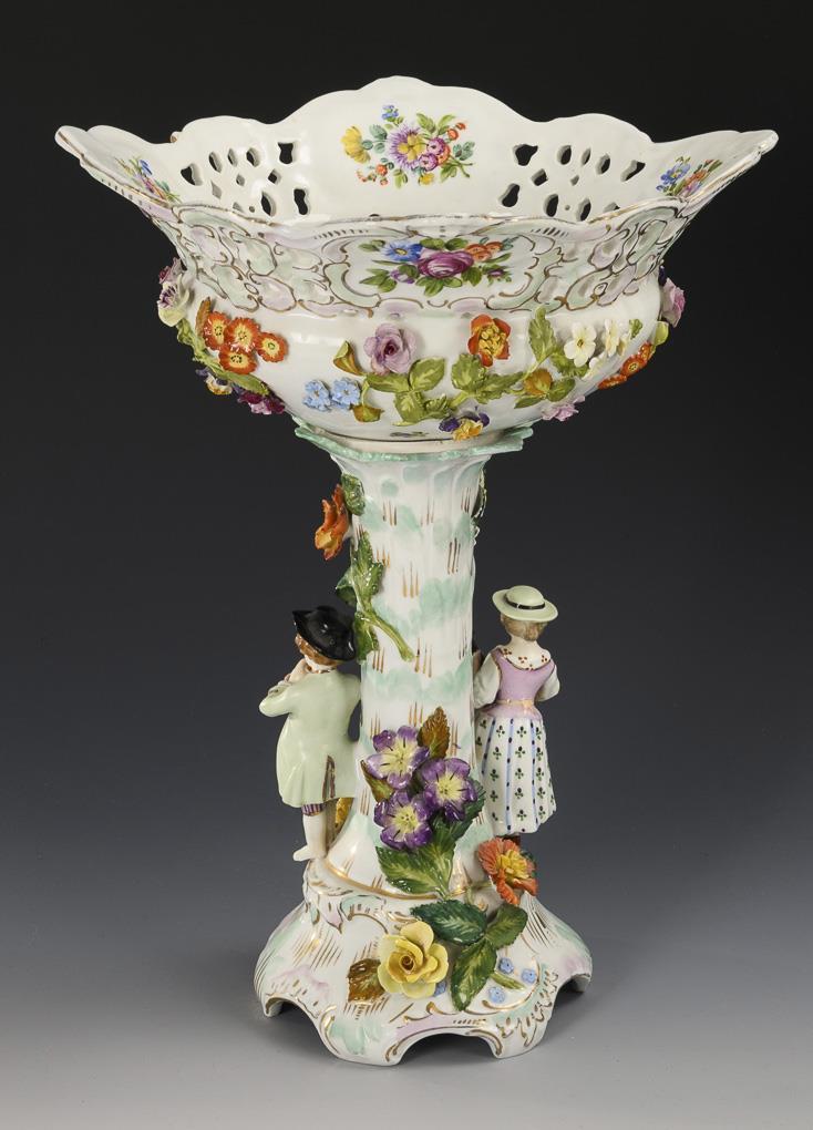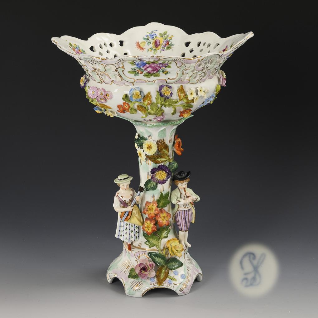 Richly flower-covered, four-pass pierced bowl, on a flower-covered tree trunk shaft with two children playing music standing on the shaft, six-pass foot. Mounting renewed, restoration to the bowl rim, flowers partially minimally bumped or restored, mandolin head, left hand and flute of the boy restored, gold partly rubbed.