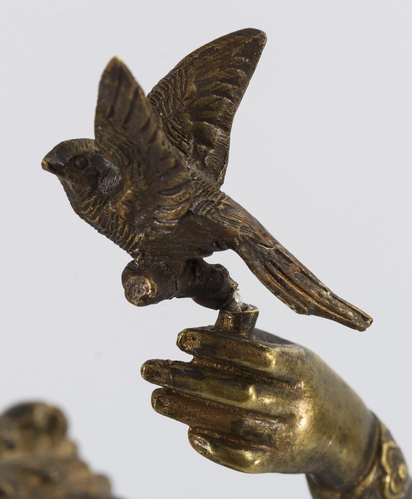 Woman standing in an antique-style robe with a bird in her raised hand. Solder on the bird broken, patina largely removed, some signs of age/use.