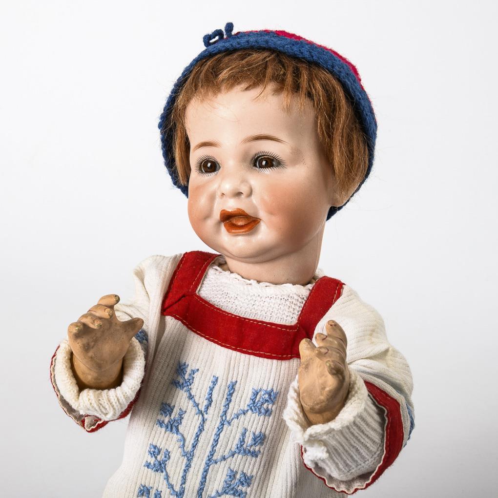 Defective baby doll with cranked head, brown sleeping eyes, open/closed mouth and red-brown mohair wig. 5-part standing doll body. White dress with red trim and blue embroidery, crocheted hat, blue oilcloth shoes. Glued break at the back of the head, small repair to the left eye. L 35 cm. Comes with a brown horse with faux fur, on a wheeled plate (23 x 23 x 8 cm).