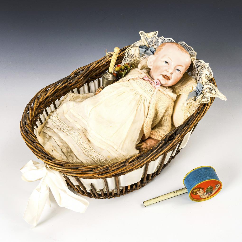 So-called "Kaiserbaby" with full head, painted blue eyes, open-closed mouth, 5-part sitting baby body, white dress and cardigan. Head without defects, body rubbed. L 28 cm. With 2 rattles and oval wicker basket.