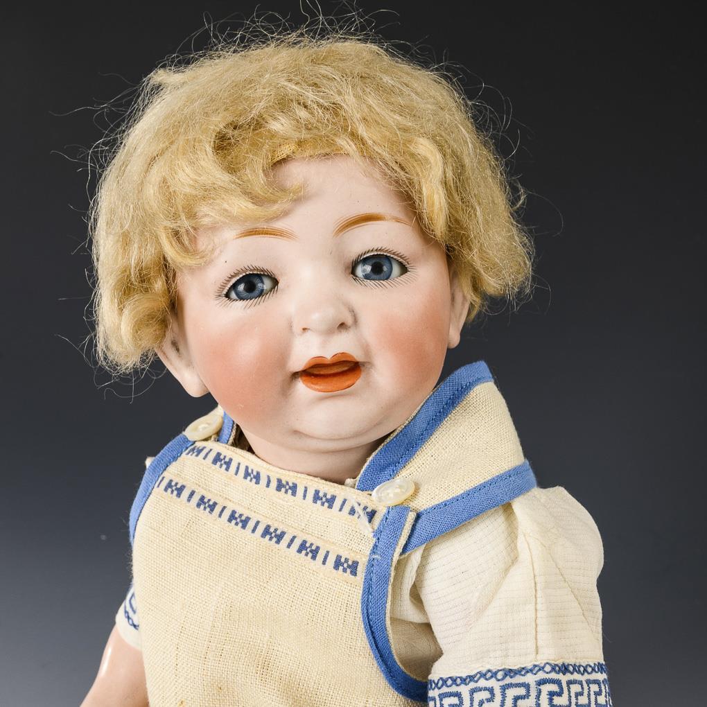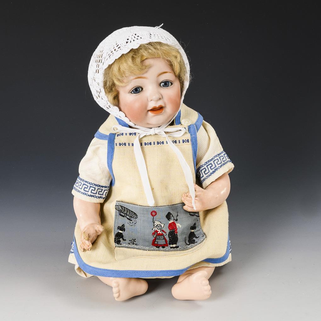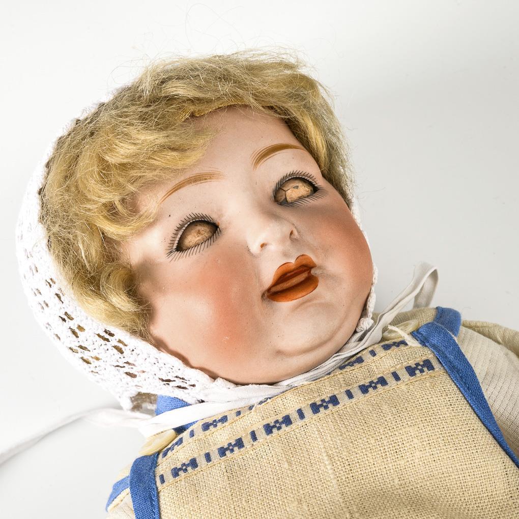 Cranked head, blue sleeping eyes, blond mohair wig. 5-part sitting baby body. Light-colored dress, apron with child motif, white crocheted bonnet. Tiny burn mark on the right eye. 1 arm with color defect, 1 finger glued.