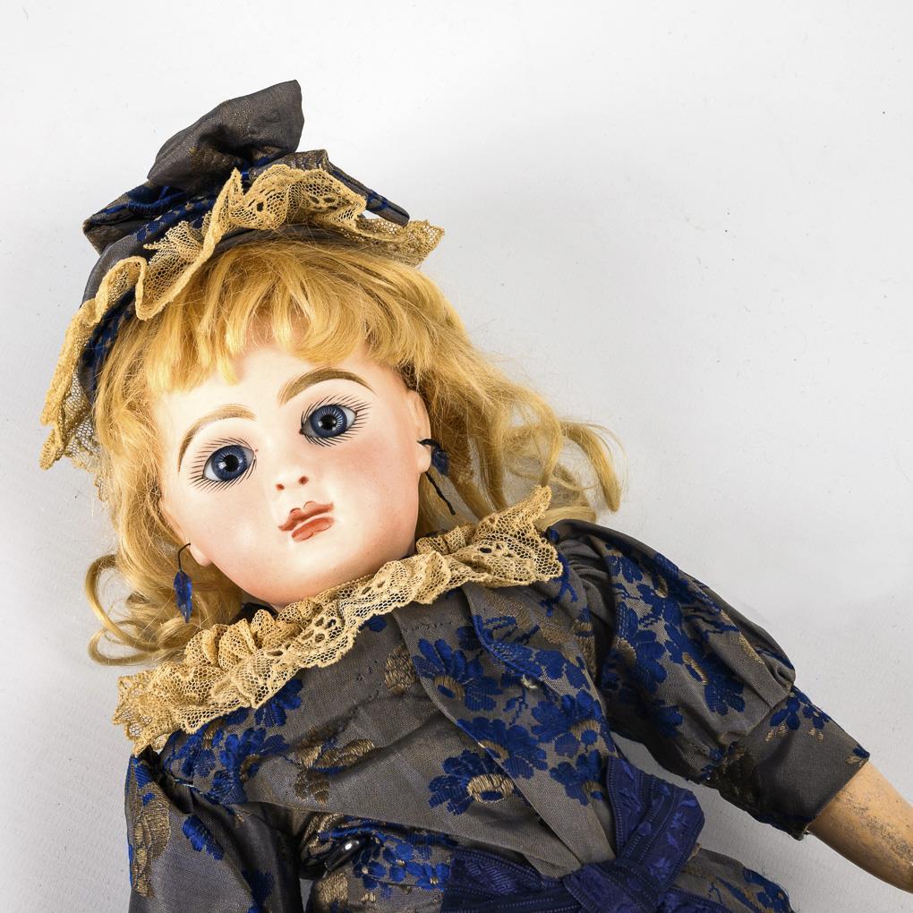 Cranked head, fixed blue eyes, earrings, blonde mohair wig, cork lid. 11-piece jointed body. Blue flowered dress with lace, matching hood, old leather shoes. Head x-rayed: without cracks, only small chip to the left ear hole and to the crown of the head. Hands and feet with traces of repair.