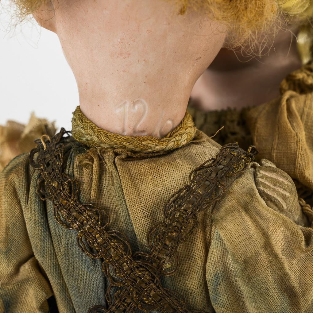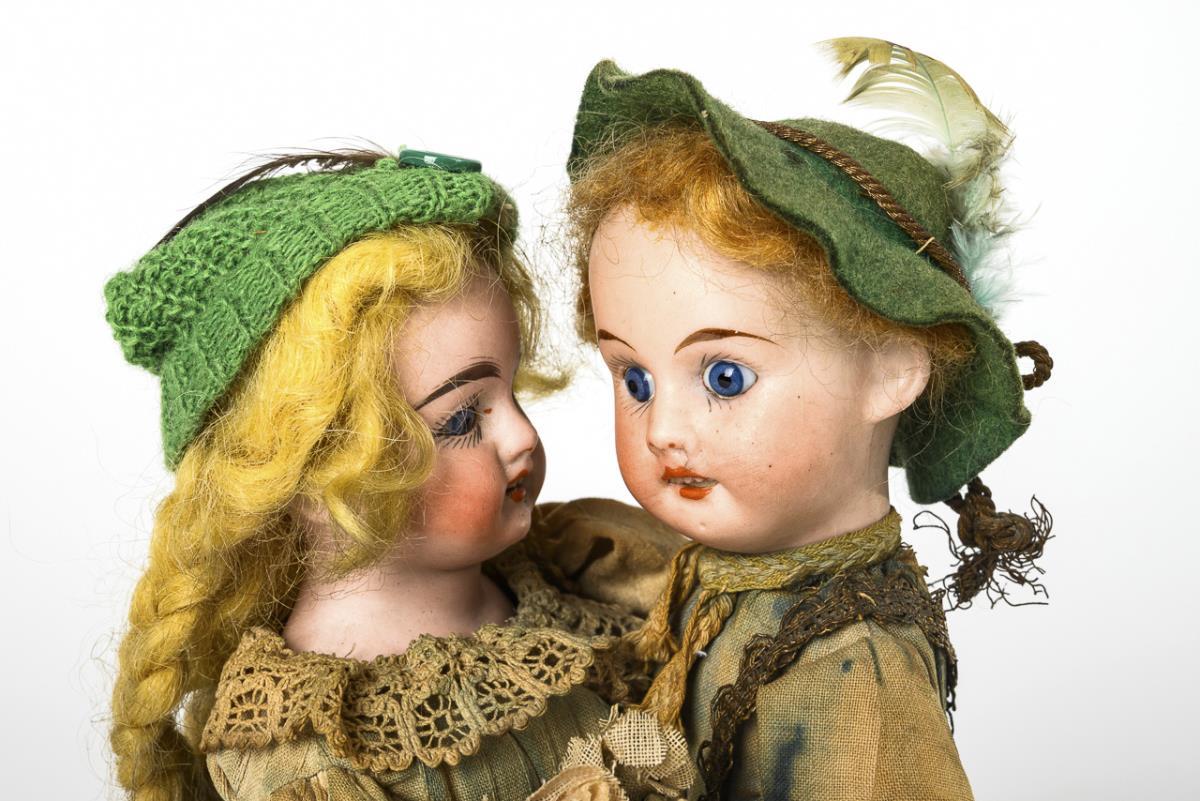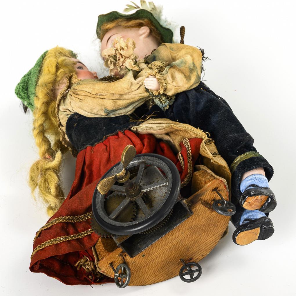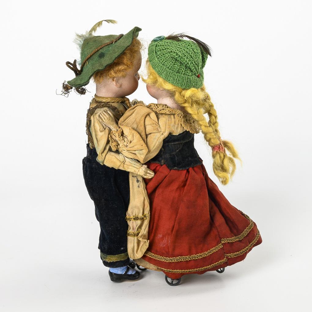 Lady with crank head, blue glass eyes, blonde mohair wig and dress with red skirt and apron. Gentleman with crank head, blue glass eyes, mohair wig, Tyrolean hat and black velvet trousers. Signs of age. 1 hand and possibly legs replaced. Movement runs, but figure does not move.