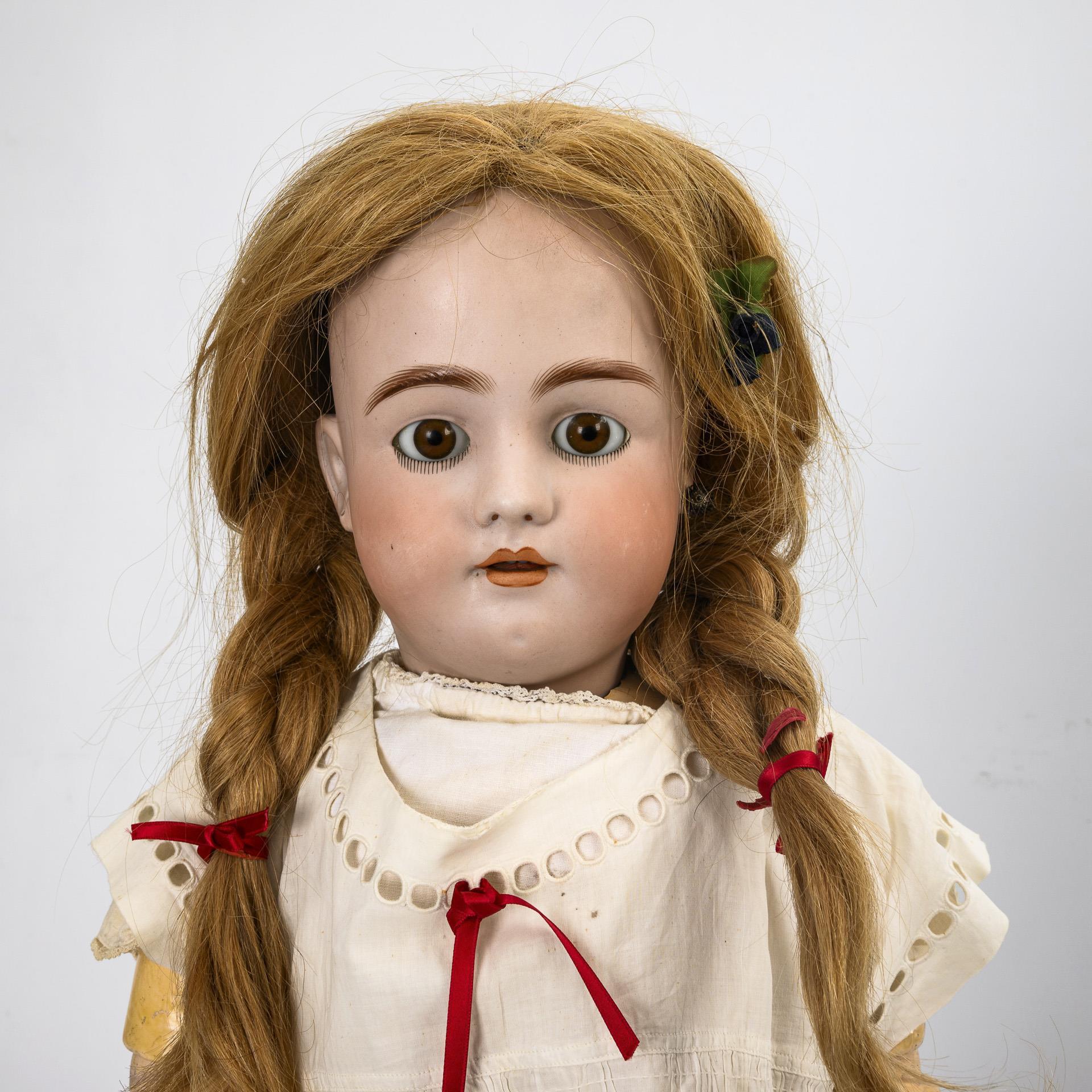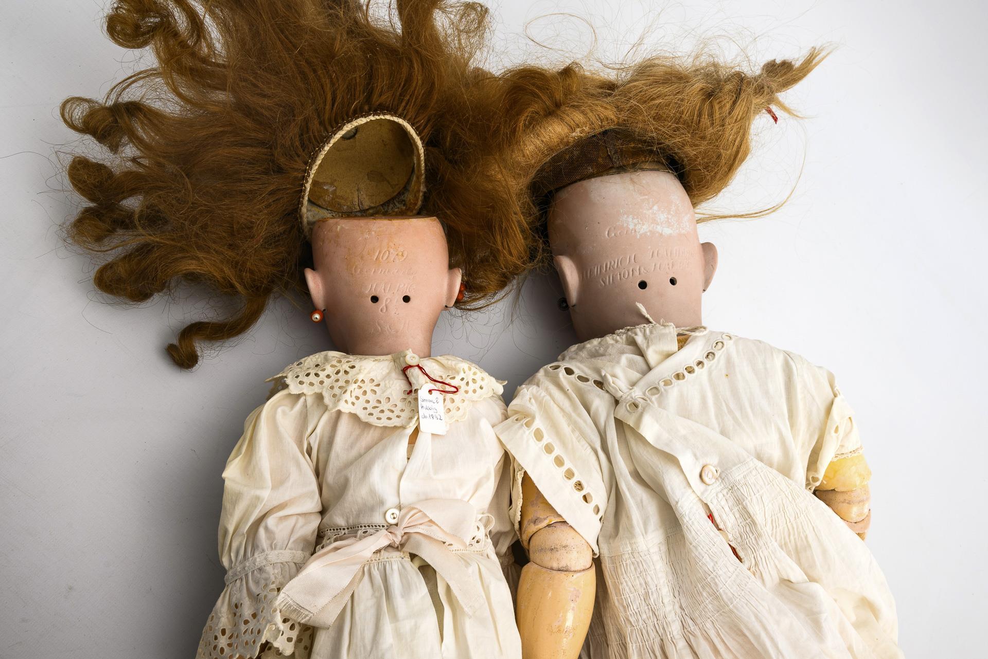 Both with crank head, brown sleeping eyes, real hair wig and jointed body. 1x Heinrich Handwerck/S & H with blond wig (back of head with wig, painted body, right hand repaired. L 73 cm). 1x S & H 1079 with brown bead (head slightly warped, with bead pull and tiny chips, hands repaired. L 56 cm).