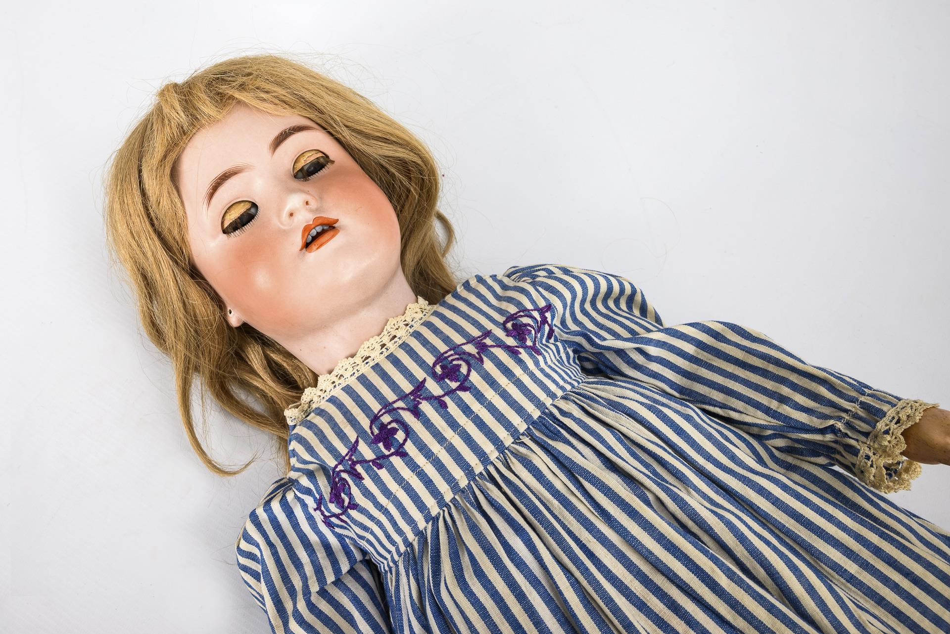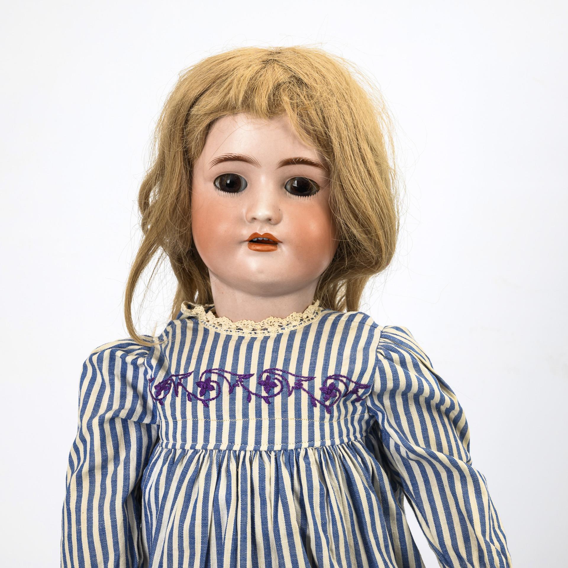 Crank head, brown sleeping eyes, eyelashes, earlobes, long human hair beads. 15-part articulated body with defective train voice (train wheels missing). Blue and white cotton dress, white boots. Head cover firm: not x-rayed, but no defects visible, only 1 tiny chip on the left earlobe. Right thumb repaired.
