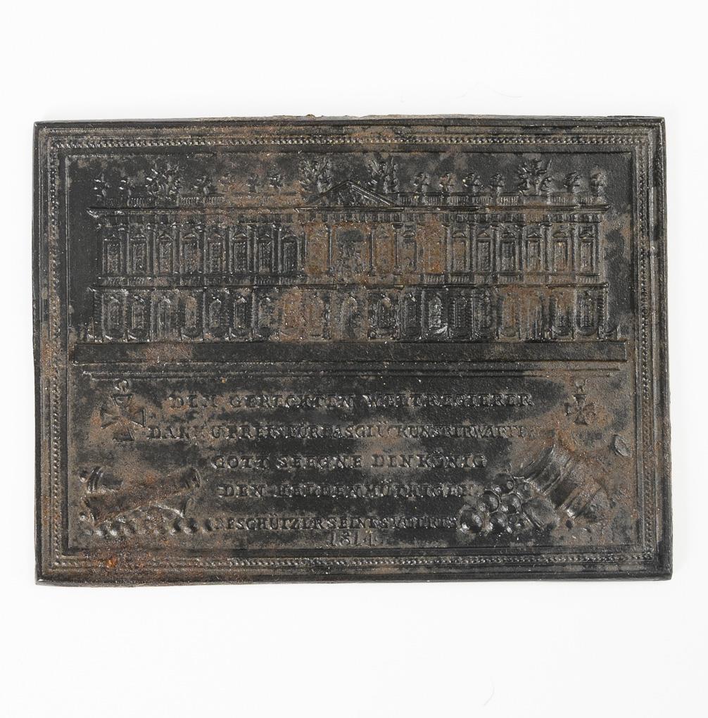 Rectangular plaque with a view of the Berlin arsenal; below raised inscription: "Dem gerechten Weltregierer Dank u: Preis für das Glück unserer Waffen Gott segne den König den heldenmüthigen Beschützer seines Volkes 1814". Without eyelet, rusty.