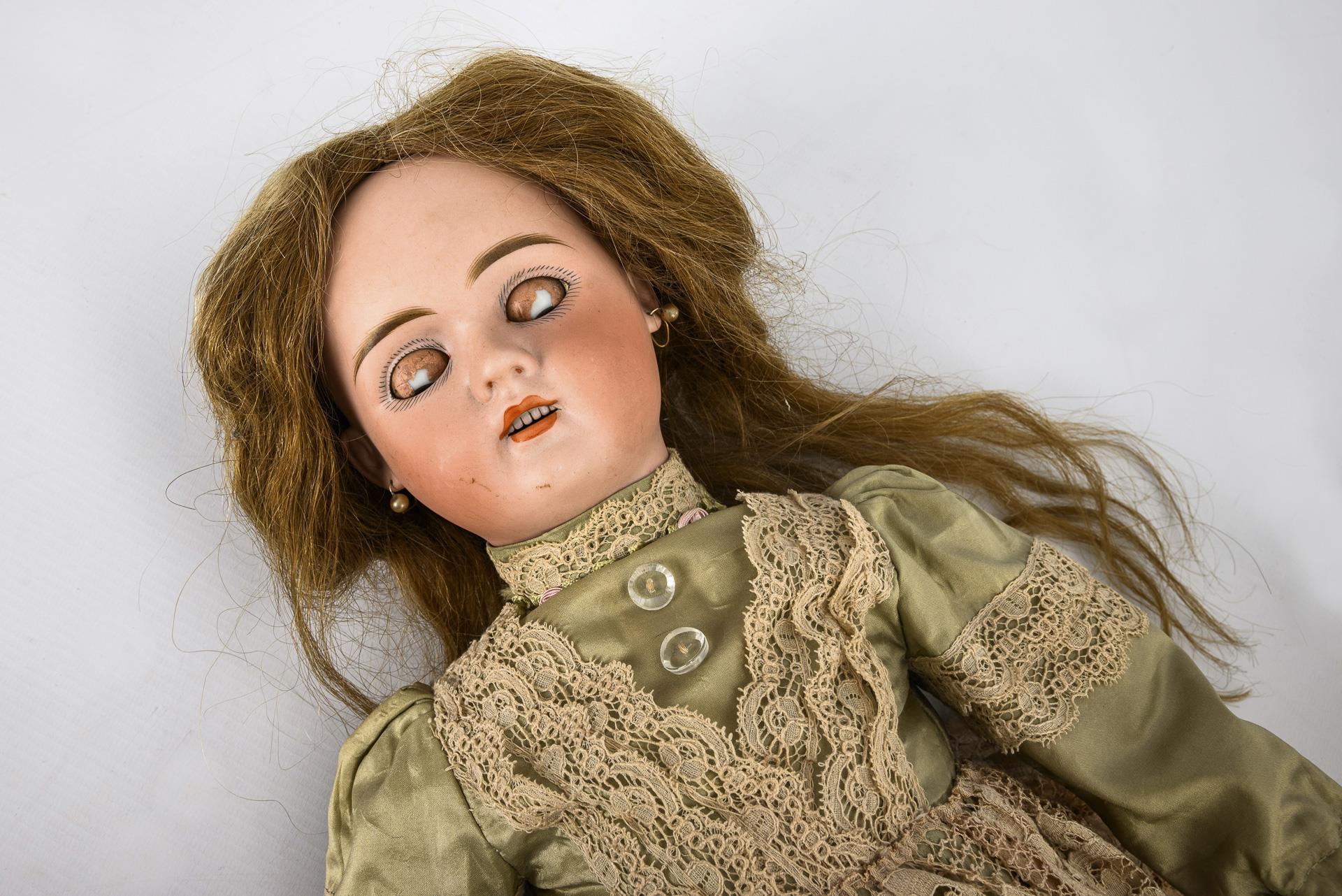 Cranked head, brown sleeping eyes, pearl earrings, real hair beads. 11-piece articulated body. Lime green dress with lace, light brown leather shoes. Head x-rayed: no defects, only 3 tiny burn marks, 1 chip on left ear hole. Body with small color defects, partially painted.