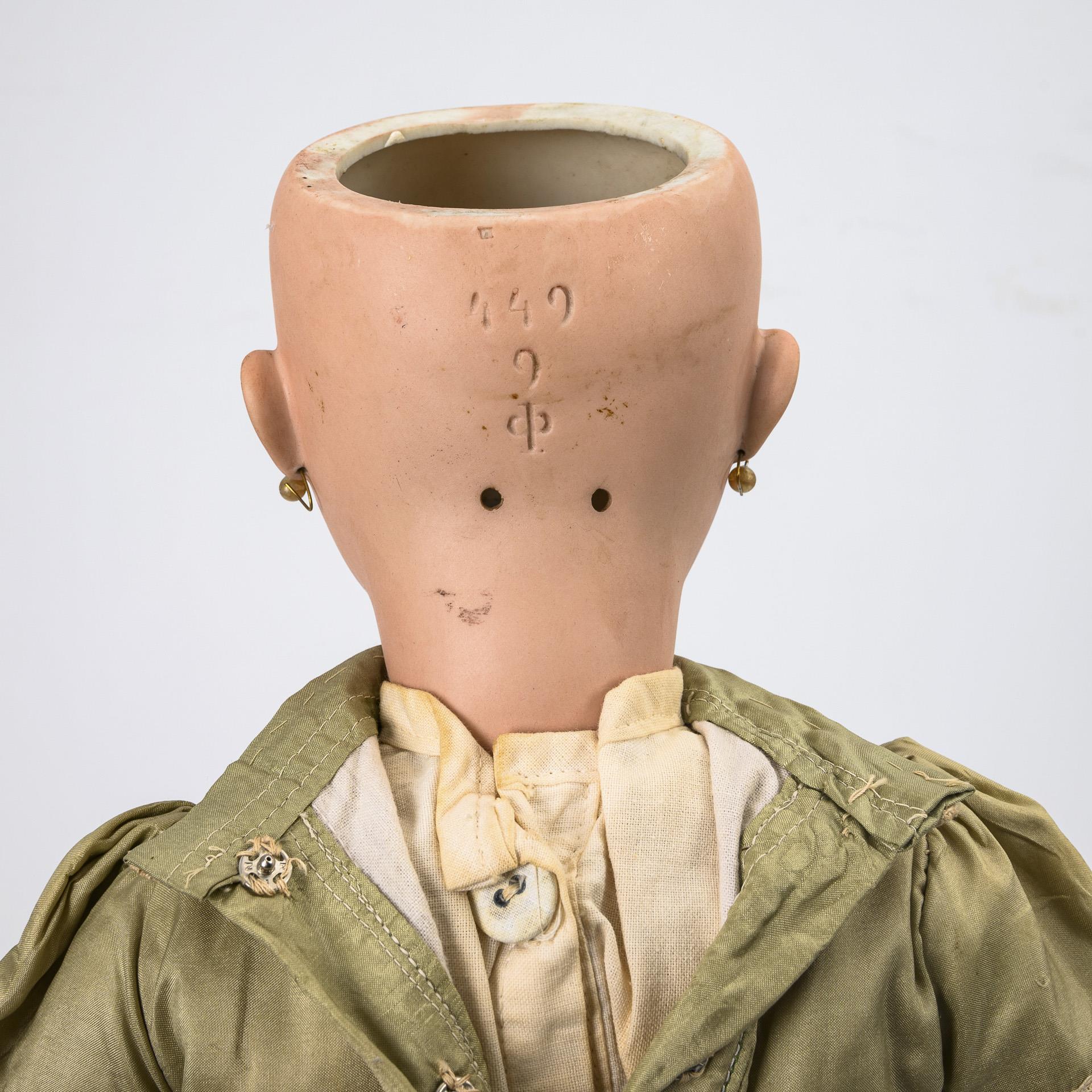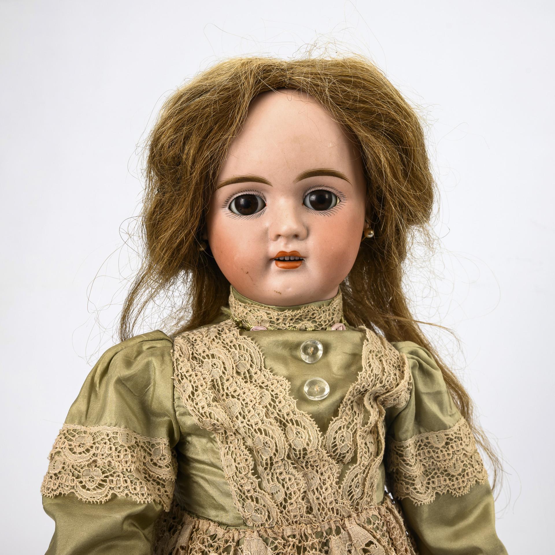 Cranked head, brown sleeping eyes, pearl earrings, real hair beads. 11-piece articulated body. Lime green dress with lace, light brown leather shoes. Head x-rayed: no defects, only 3 tiny burn marks, 1 chip on left ear hole. Body with small color defects, partially painted.