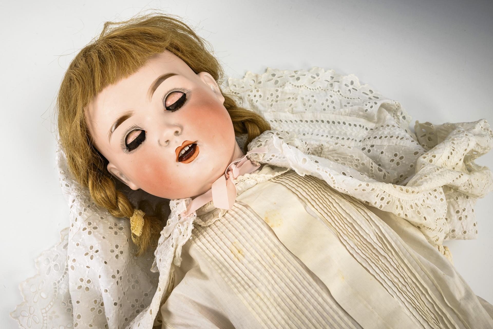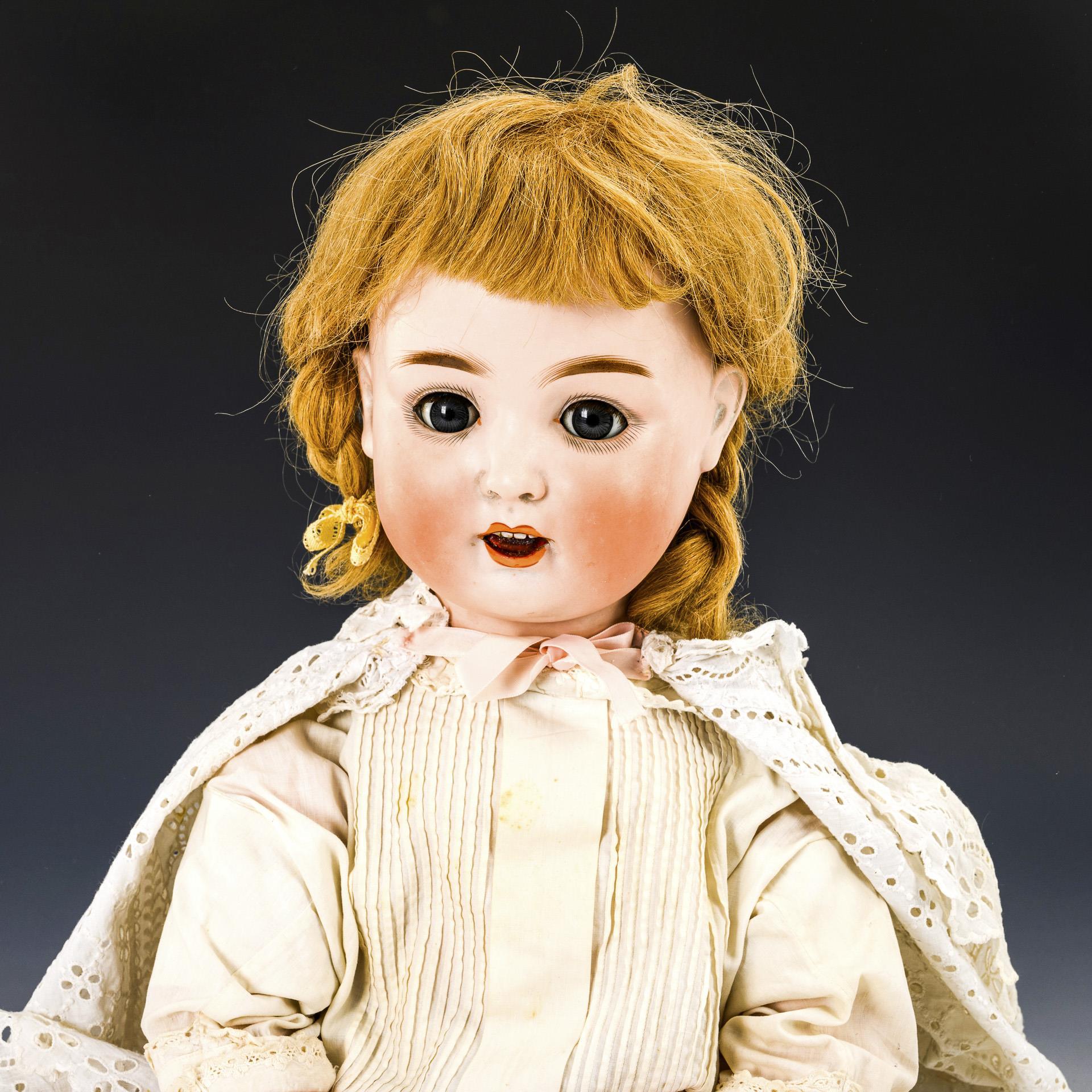 Crank head, blue sleeping eyes with eyelashes, blonde real hair with short tufts. 5-part standing doll body with intact voice. Long dress, cape with eyelet embroidery. Tiny chips on the neck crank, arms loosely stretched.