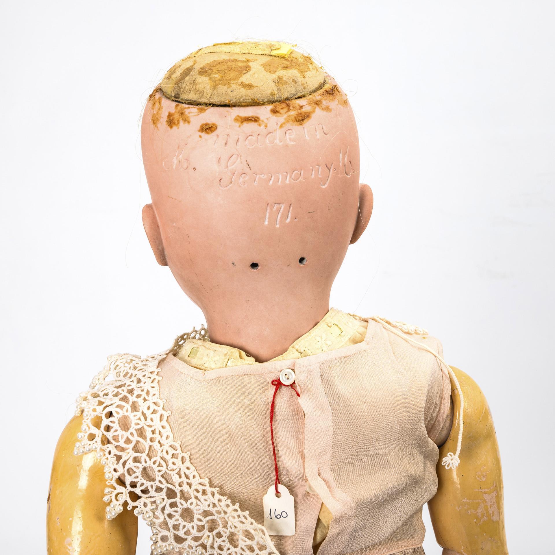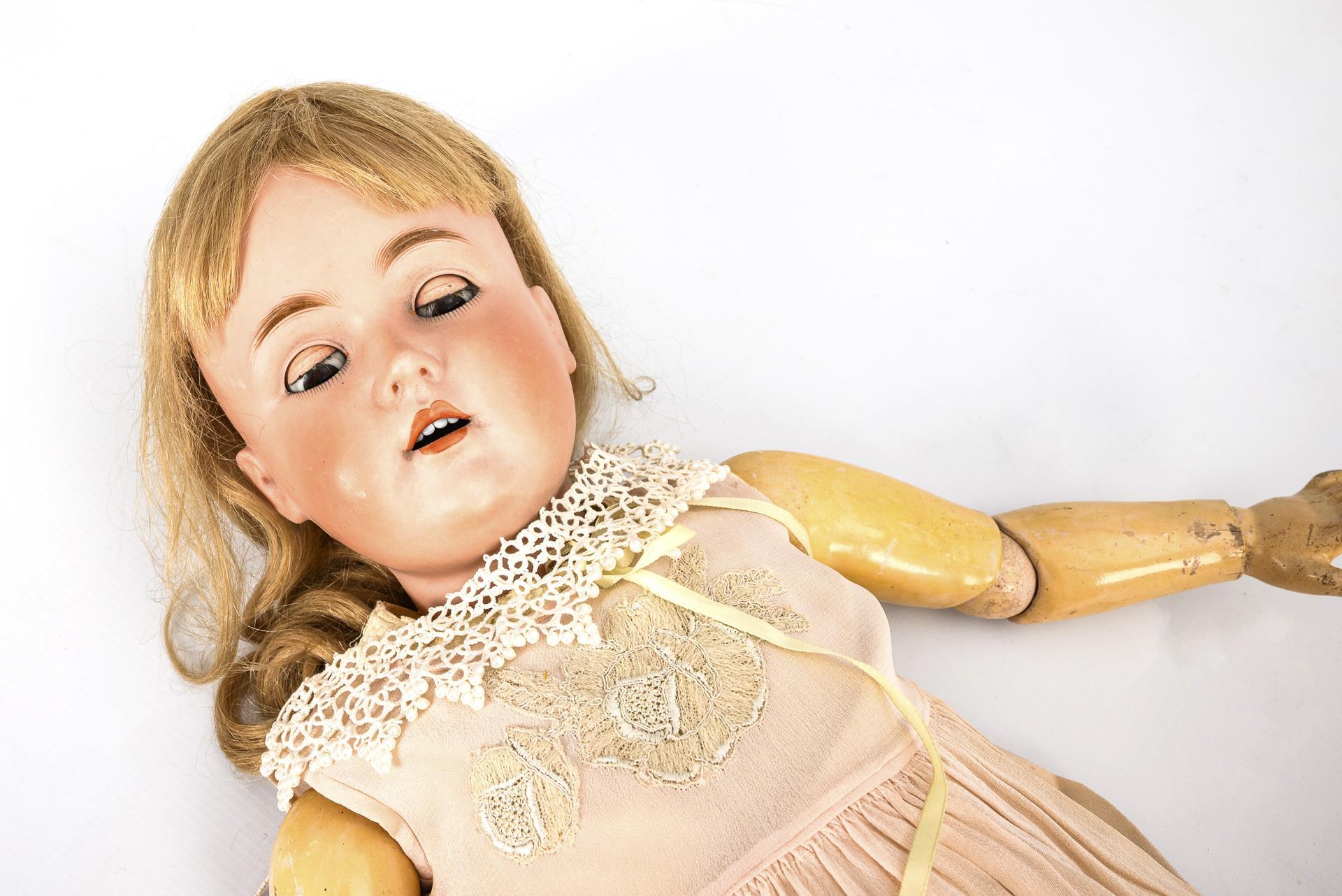 Cranked head, brown sleeping eyes, blond, slightly too small human hair. 17-piece articulated body. Long dress, salmon-colored hood, brown children's shoes. Head x-rayed: without defects, only minimal color abrasion on the right side of the head. 1 finger repaired on the right, right foot; with color defect.